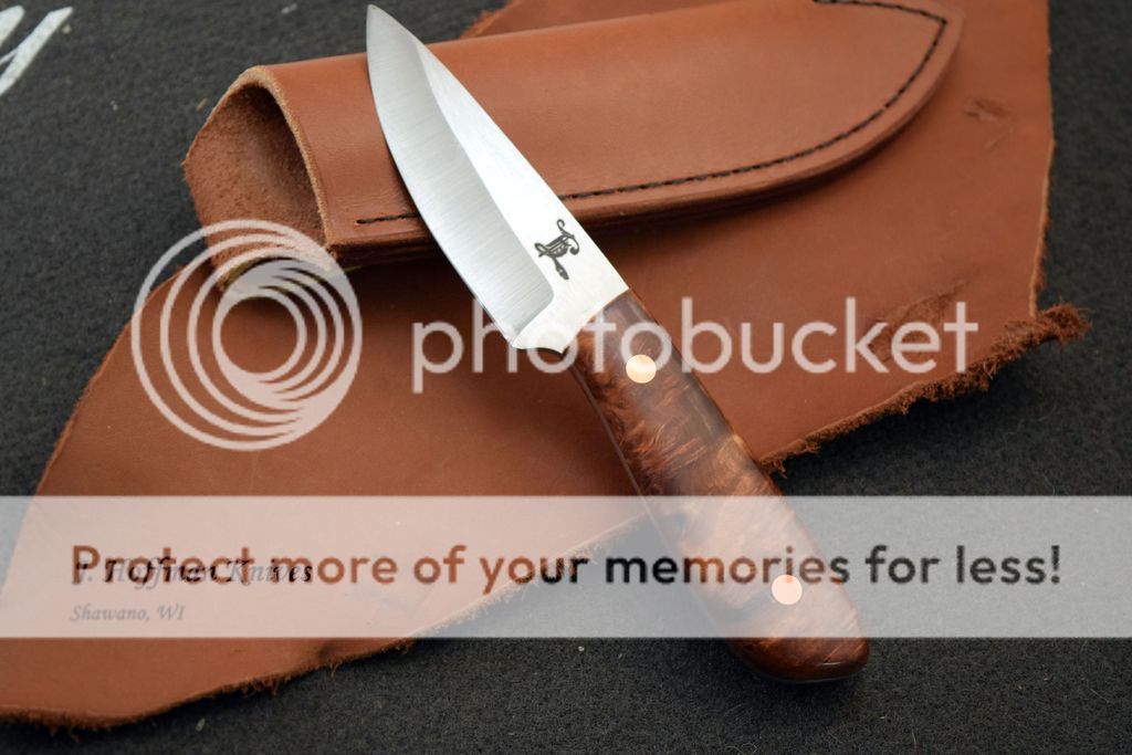 This is a small EDC in 1/8" AEB-L. The handle is stabilized Amboyna Burl with copper hardware. The blade is hollow ground with a machine finish. The knife includes a handmade leather sheath. The wood for the handle was professionally stabilized. Questions and Comments are always welcome. Thanks for looking.