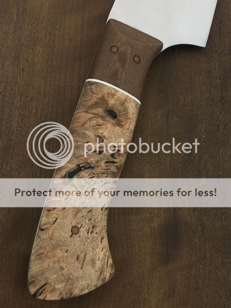 I have a couple of kitchen slicers up for sale here tonight. The first is an AEB-L chef that has some really cool Czech Maple Burl that I got from Mark at Burl Source. I've been waiting for the right project to use it on and this seemed right. The bolsters are Warwood and it has natural micarta liners with white G10 pinstripes. I have been using a compound grind with the top half flat ground and the bottom convex. This seems to help with food release and allows the spine to retain some rigidity. This should make a great all around kitchen performer.