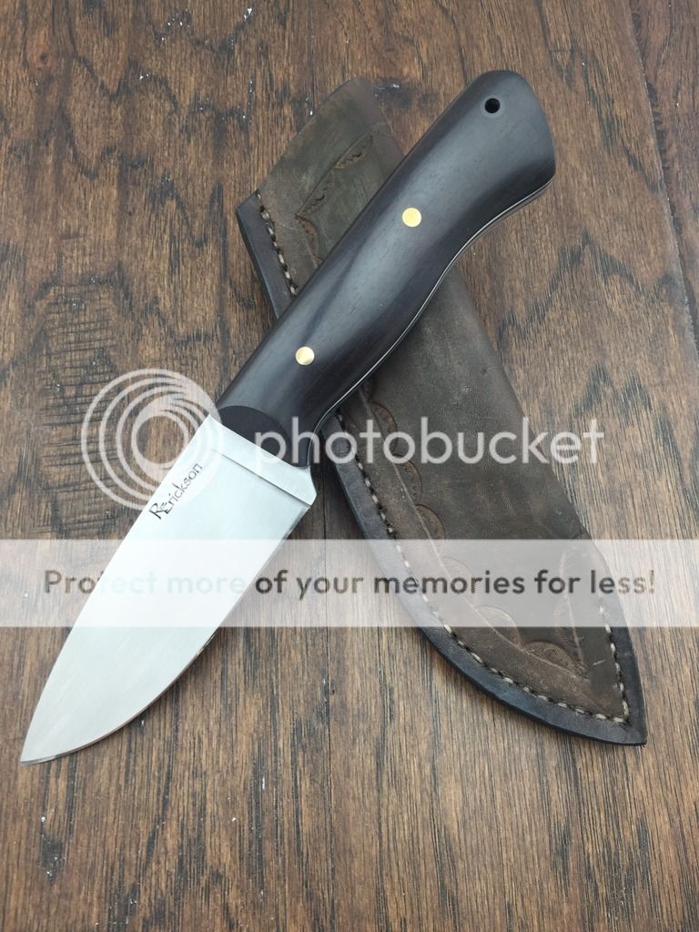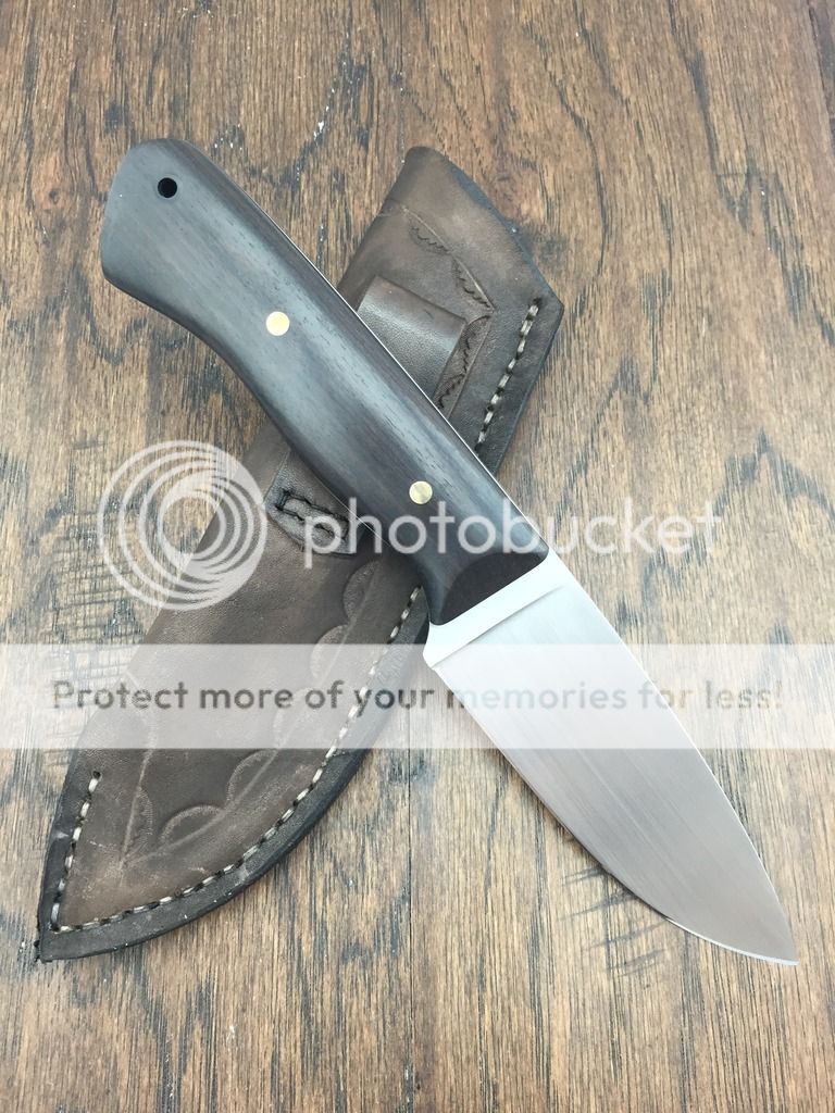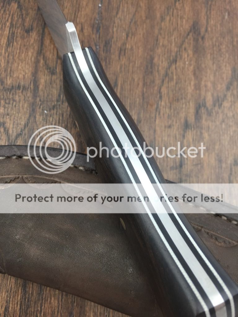 I'm reposting this hunter and dropping the price on it. It's 0.13" AEB-L steel and has African Blackwood handles. It's full flat ground and sharpened to 17 DPS. The blade has been heat treated to RC61 by Peter's. The liners are black and white G10. It has bronze pins and a carbon fiber lanyard tube. A pouch style leather sheath is included.