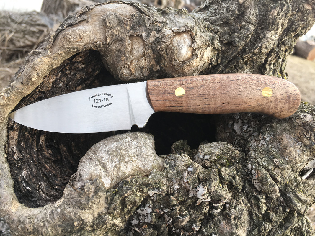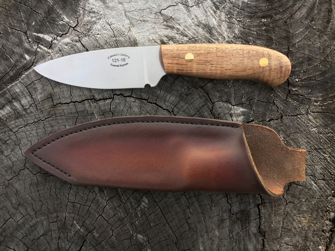 I heat treated the blade myself in my Jen-Ken kiln, did a dry ice, acetone bath with a triple temper at 375 degrees. It has a 400 grit, hand sanded finish, with a rounded spine and ricasso.