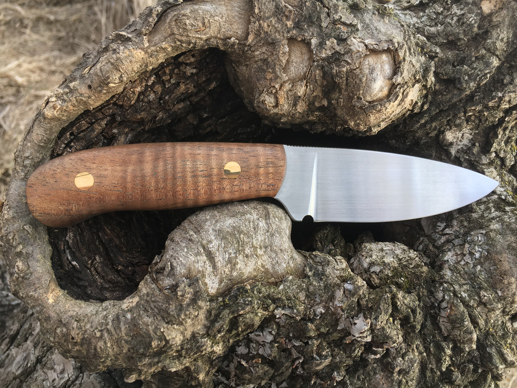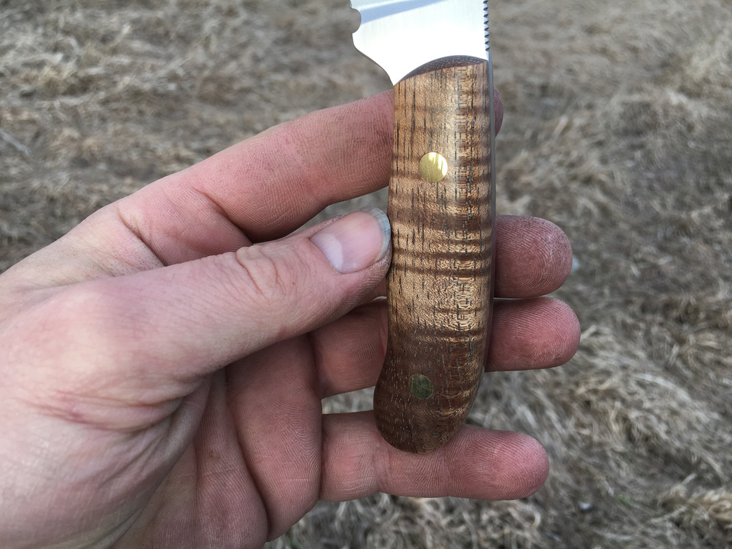 The handle is Koa that has been stabilized by K&G. I used G-Flex and brass corby bolts to attach the handle to the blade.
