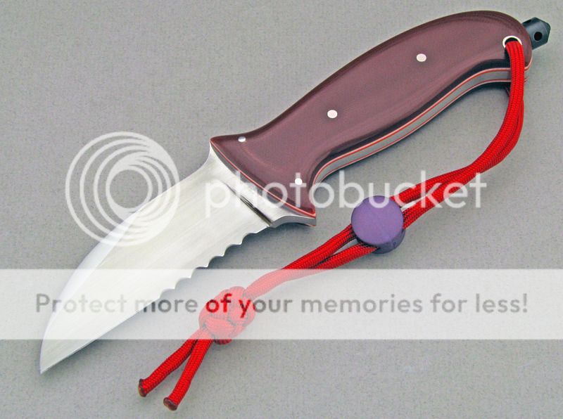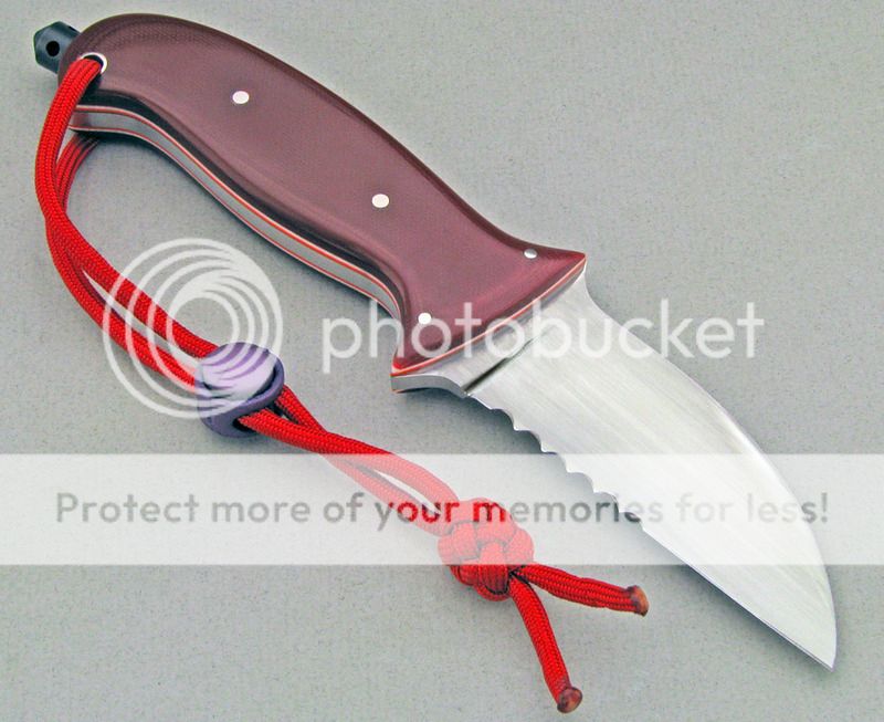 My daughter joined the local volunteer Fire Department, so I made what Im calling a Rescue Knife for her to use while on duty. I used AEB-L steel for the partially serrated blade, red G10 with orange and white liners for the handle, and titanium for the pins and thong tube. The edged portion of the blade is about 3.5 inches long. Id call the blade shape a Wharncliffe, but perhaps its actually a Sheepsfoot (Im not really sure of the difference).