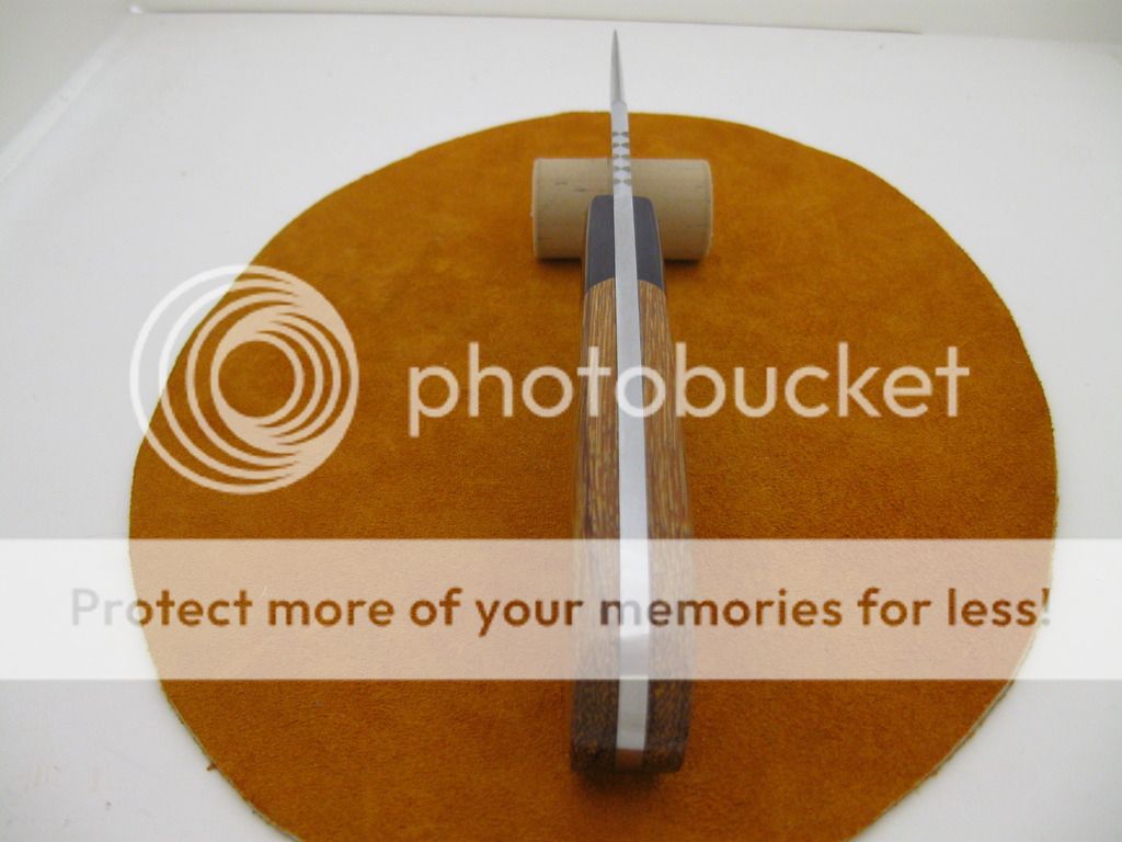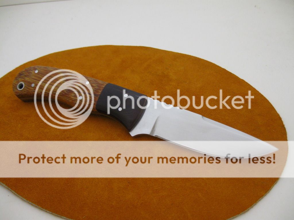 Linen maroon micarta bolster, marble wood handle with dovetail, lanyard hole.