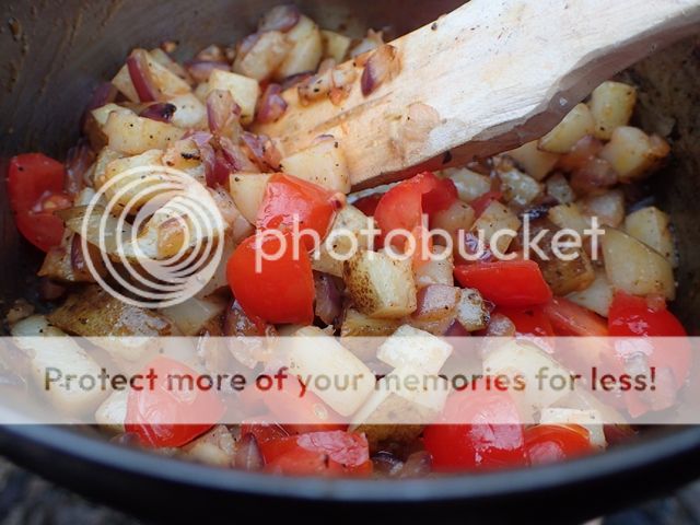 Olive oil, add cubed potatoes, diced onions after a few minutes. Add cut up tomatoes after stirring the taters and onions for about 5-7 minutes…stir. Add raw eggs, cover and let eggs cook.
