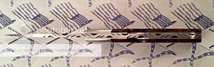 UK legal, similar in proportions to GEC's #73. The covers are book matched Desert Ironwood, dovetailed into the bolsters. The blade is FFG S30-V.