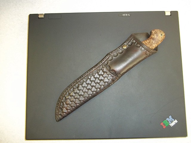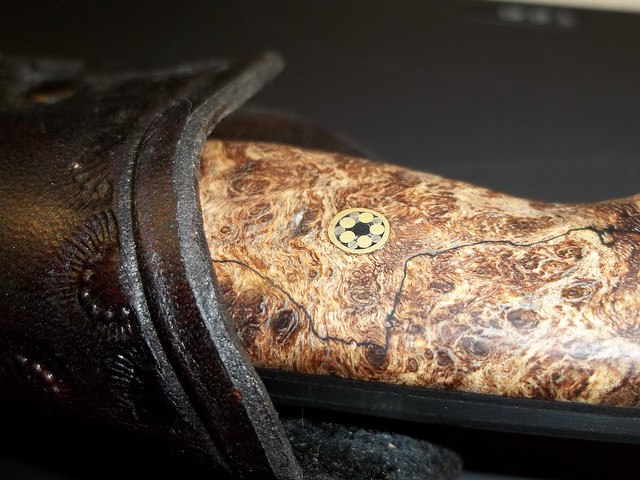 In sheath close up, and a little pulled to show mosaic pins and handle.