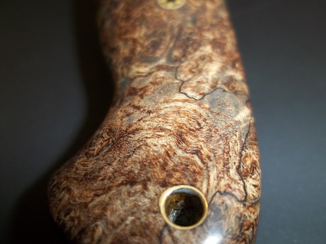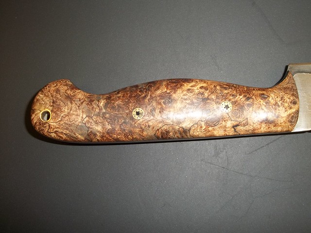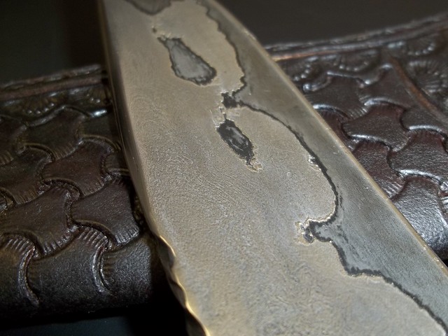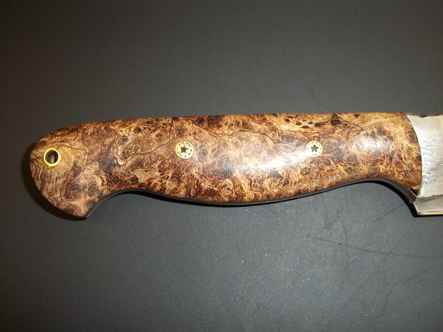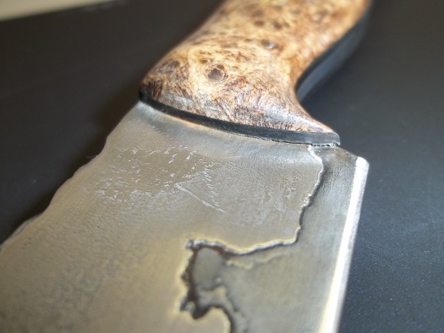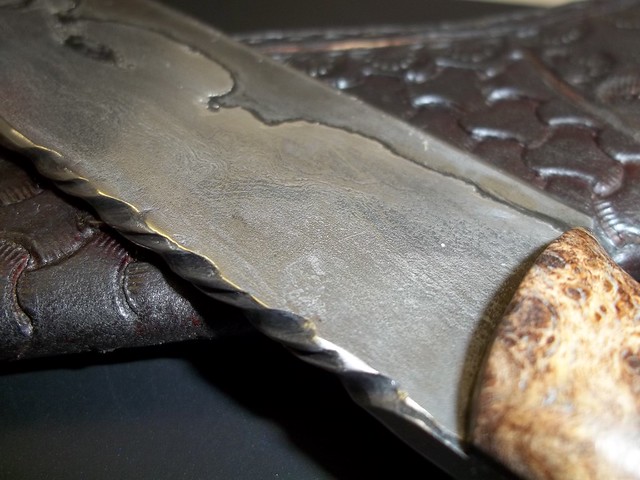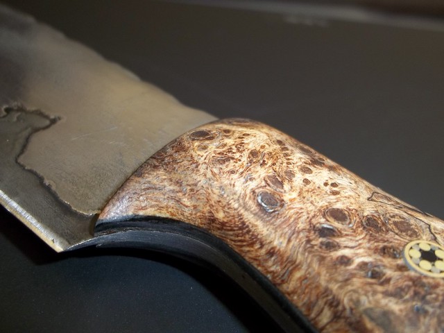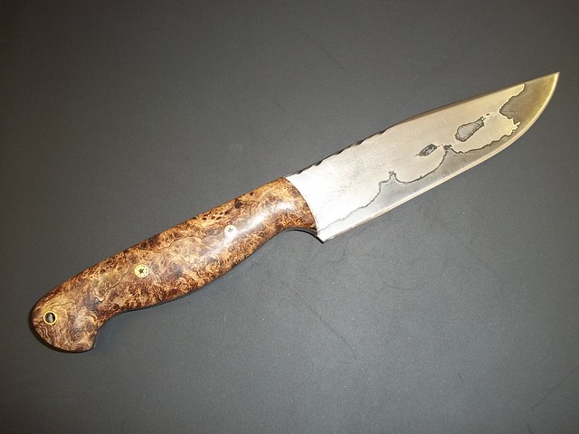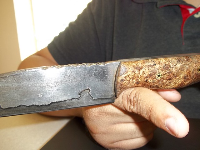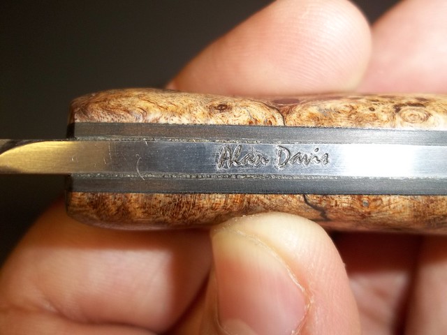 AlanD (BF Knifemaker), or Alan Davis of Texas, recently posted a knife for sale in our very own BF Knifemakers Subforum upon looking at it, I knew it was something I had to have. The extra heavy acid etch, the scales, the filework, the maple handle all interested me. The sheath was also nice. So I had to have it, luckily he lives in Texas so I figured quick movement once it was shipped.