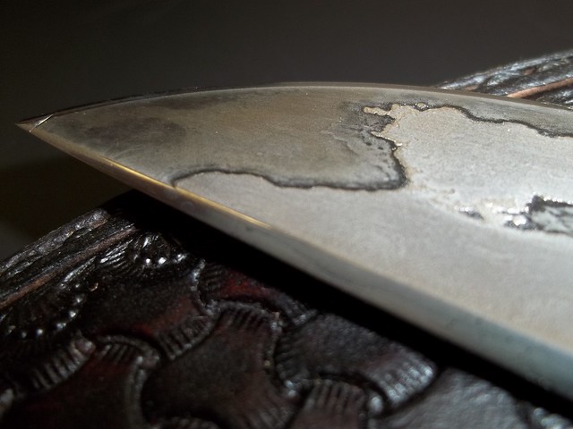 Beautiful knife. First 1 1/2" came shaving sharp, the rest was acceptably sharp. Sharpness is not something I value too much, after all once you use it it's gone. Only potential flaw I found was the tip was "slightly" rounded, but still functional I think it was designed that way by Alan, as his grinding work on the knife is very good. A nice feature I dont see often, or at least maybe isn't brought to attention often? is a small carving of the leather sheath for the spine to be guided into. Along with a secure edge, this allows for minimal contact on the sides of the blade with the leather for rust prevention.
