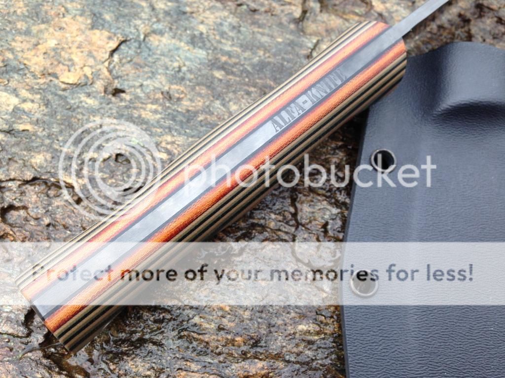 AK3 This is an 1/8" O1 blade heat treated to 59-60 rc. The blade has been blackened with etching acid. OAL 7 1/4" with a 3" cutting edge. The scales a G10 with black lines and fiberglass pins. sheath included. $180