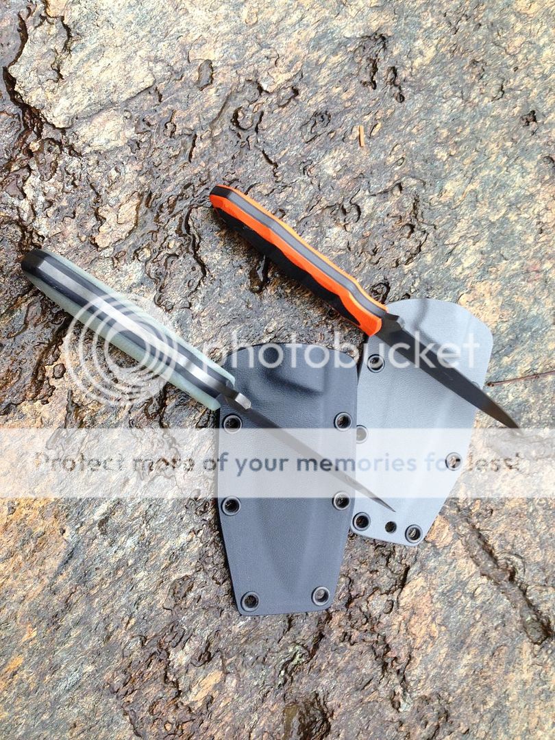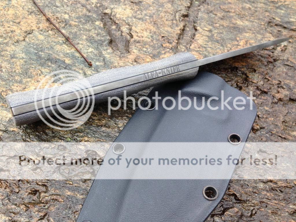 AK4 This is an 1/8" O1 blade heat treated to 59-60 rc. The blade has been blackened with etching acid. OAL 8 1/8" with a 4" cutting edge. The scales a G10 with black lines and fiberglass pins. sheath included. $180