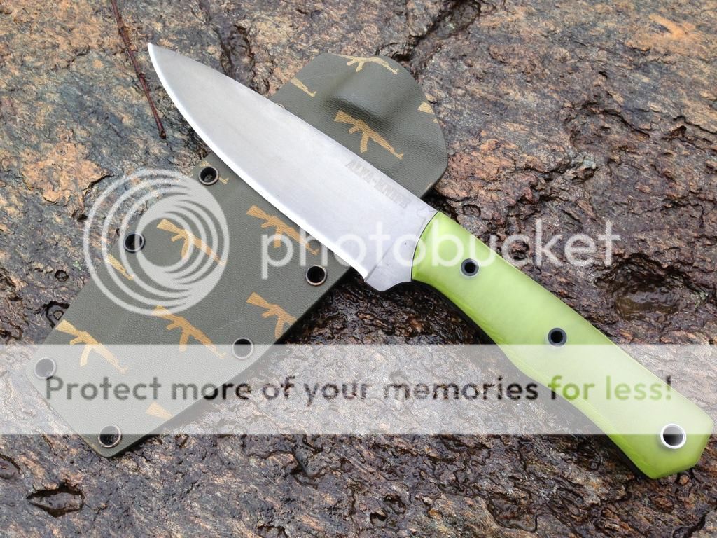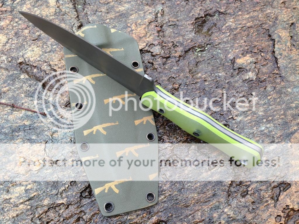 AK4 This urban skinner turned out awesome. Its a full height convex grind that's been cold blued. The 5/32" O1 is 59-60 rc, 7 1/4" OAL with a 3" blade. The scales are green canvas micarta with yellow G10 liners pinned with 1/8"carbon fiber and one mosaic. Kydex included. $220