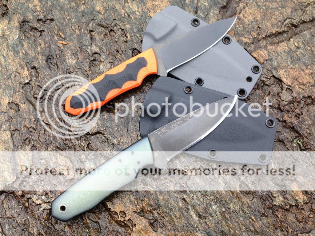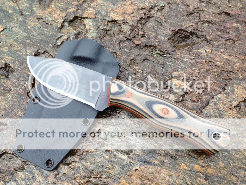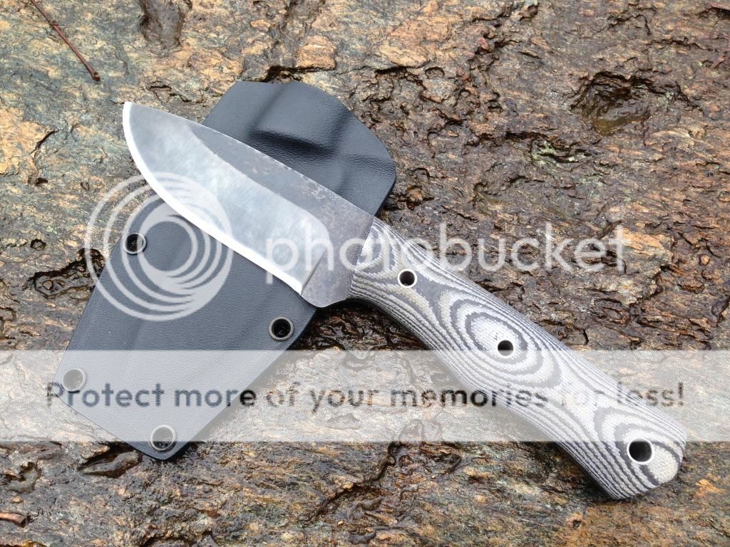 It has my convex saber grind and has been acid etched. It is 5/32" O1 59-60 rc, 8 7/8" OAL with a 4" blade. The scales one this one are some custom from shade tree white canvas and carbon fiber! The pins are all stainless tubes. Sheath included. SOLD