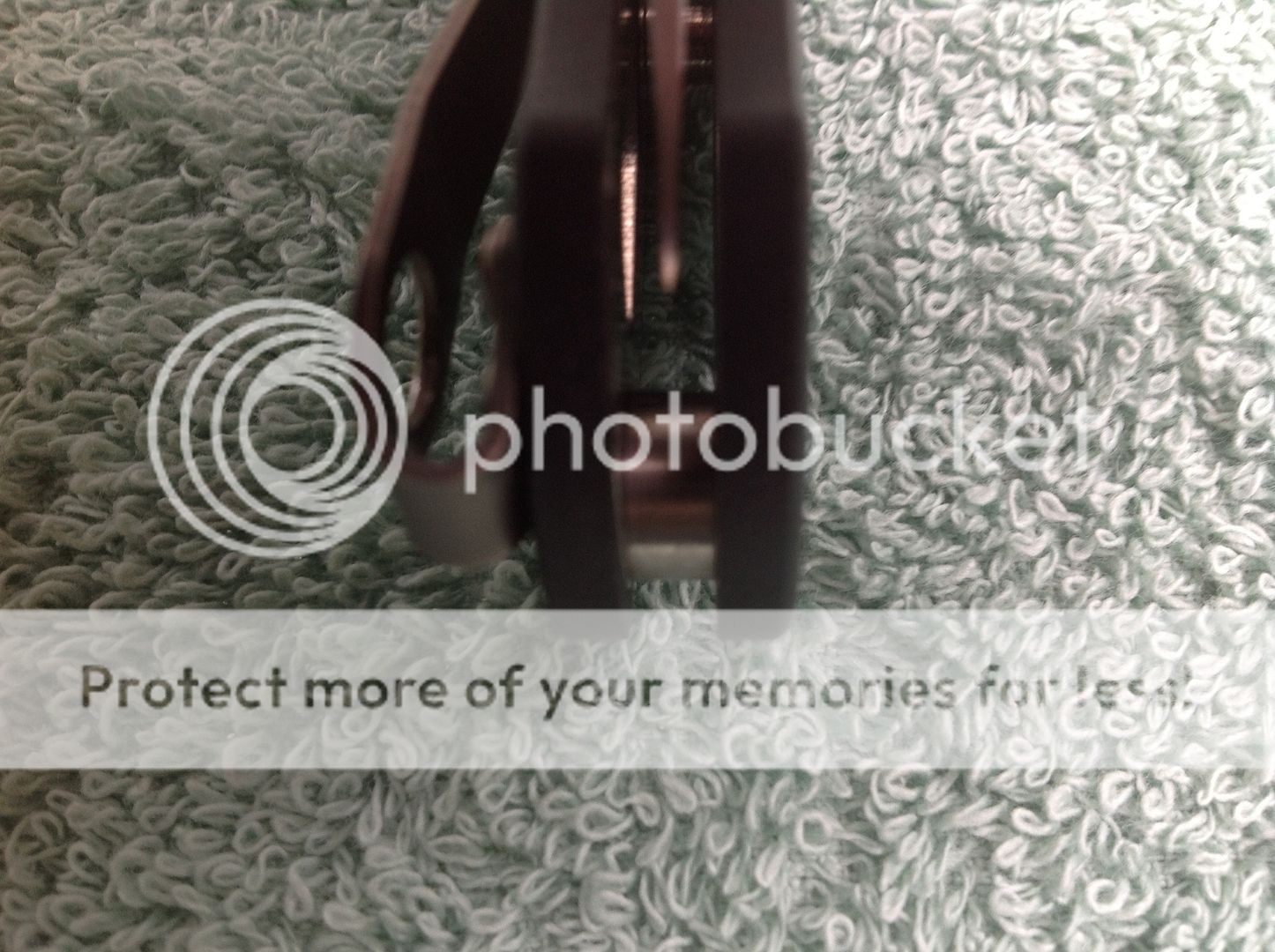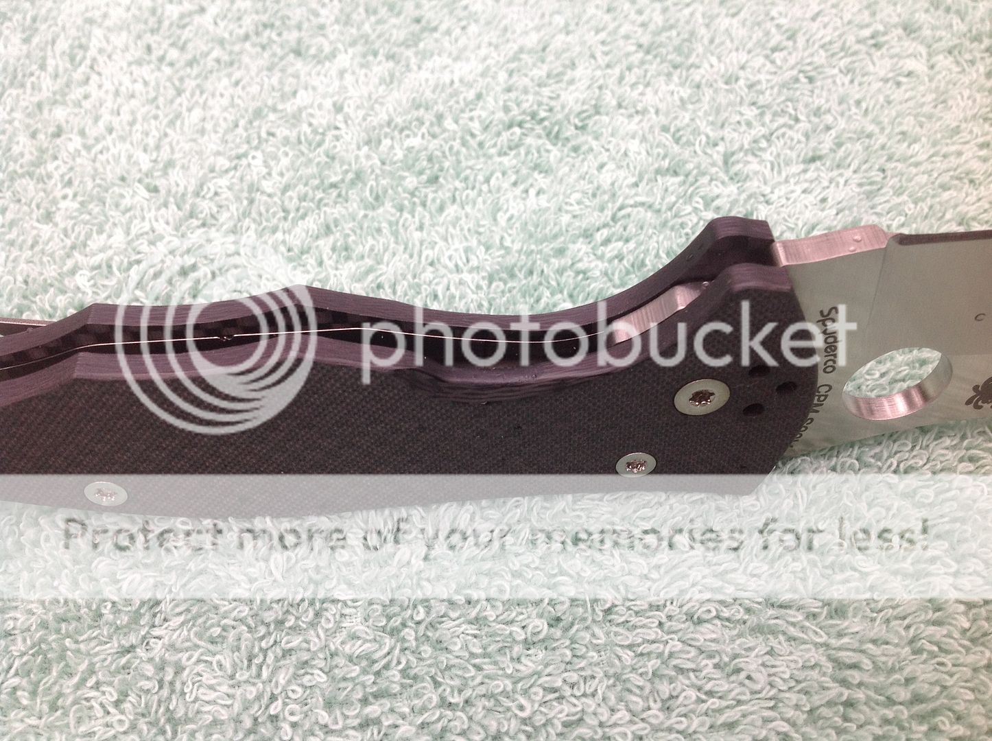 I did (with 400 grit sandpaper on a wooden dowel) sand that small cutout portion of the CF scale that impeded full access to the Spydie-hole. When I did this, a teensy little portion of the SS on the frame was exposed (1mm or so), which bothered me, so (with a toothpick) I put a small amount of black ABS cement on the over sanded bit of scale, then sanded it smooth...looks pretty good, allows full thumb access to the Spydie-hole, now. Cosmetic only. You can see clearly in fourth picture.