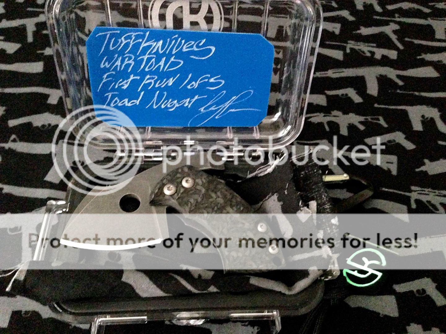 Next Up is A Wartoad Nuggent by TuffThumbz (Carbon Fiber) limited quantity=1 of 4. Comes with Pelican Case, Tuffthumbs Gun Signature Gun Cloth, Glowing TuffKnives Logo Tag, TuffKnives Card of Authenticity with Geoff's Signature and A Carabiner SOLD
