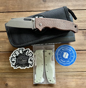 Burlap Micarta Scales & also comes with original Jade scales. This one is a Blade HQ exclusive.