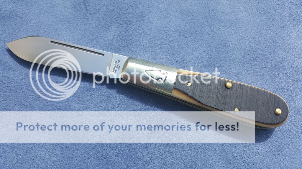 Northwoods Everyday Barlow in brown saw cut bone. This is a user. Bolsters have swirls and blade has some light scratches and a fairly uneven bevel from a previous owners attempt at sharpening. Bought it to carry but never got around to it so I'll pass it along. Includes correct bag but no leather slip. $130 SOLD