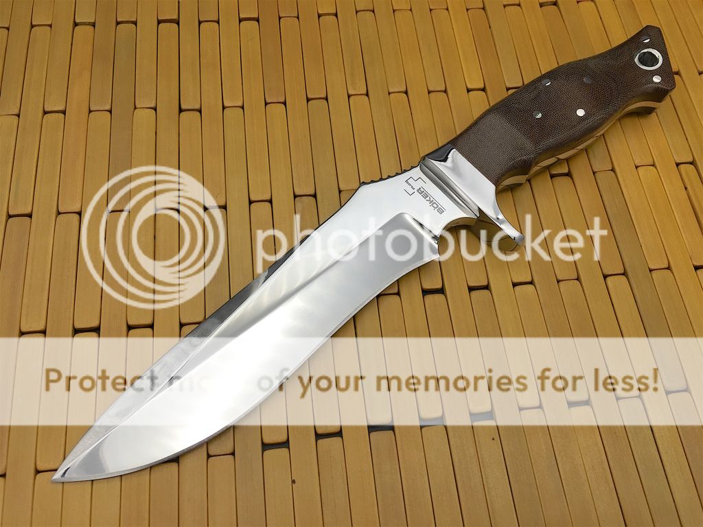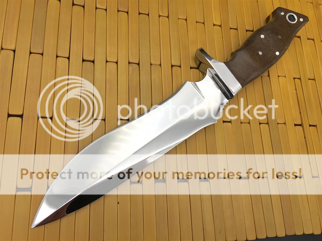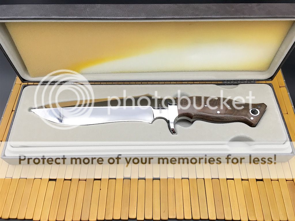 Brand new in display box, with sheath still in the plastic bag. 12 1/4" overall, 7 1/4" blade, pinned linen micarta handles over a full tang with a mirror polished guard.
