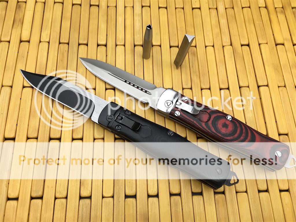 A pair of Chinese-made D2 Levelocks. Both fire nicely but the clip point one rubs a little when you close it. The spear point one can occasionally not lock completely open. Comes with the adjustment bits shown. These have pocket clips that erroneously identify them as being Microtech products (which they are not) - Selling as a pair only.
