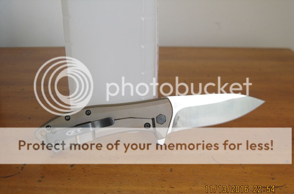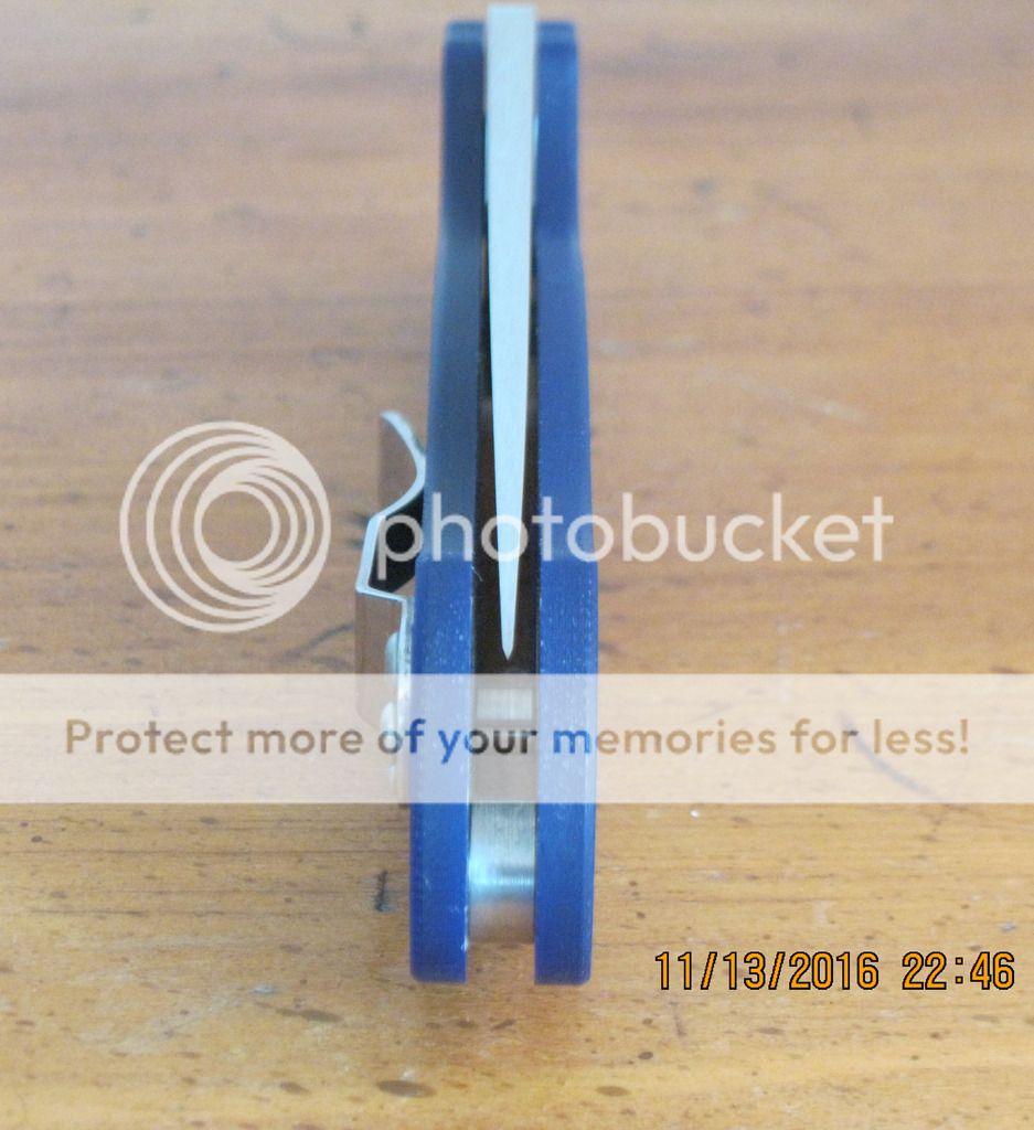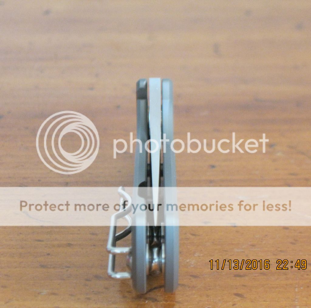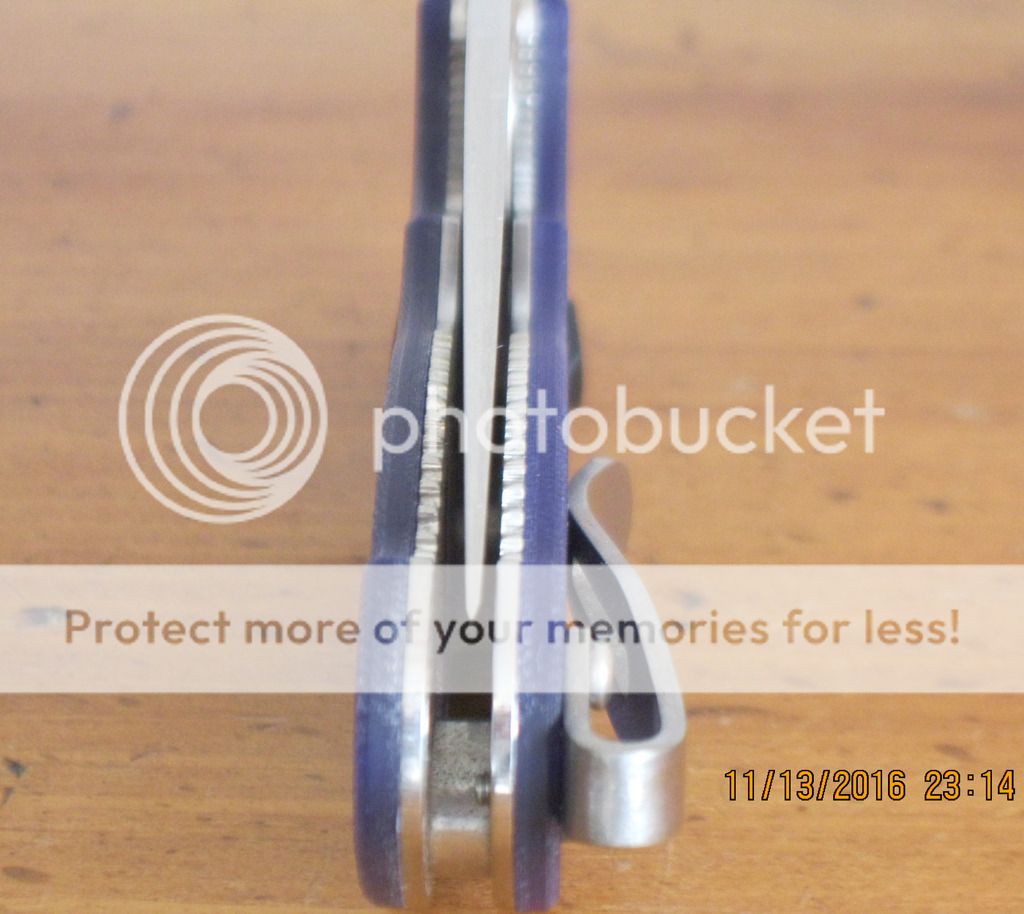 7) Spyderco Manix 2. S110V, burple. no box. Has a low rider titanium pocket clip. I carried this for probably 1-1 1/2 months so has some pocket wear. No blade play in any direction. Factory edge. Centering favors clip side a hair but not close to rubbing. Please note: 1 of the screws that cam with the titanium clip was longer than the other, it in no way, shape or form interferes with the performance of the knife (Don't have the original screws)