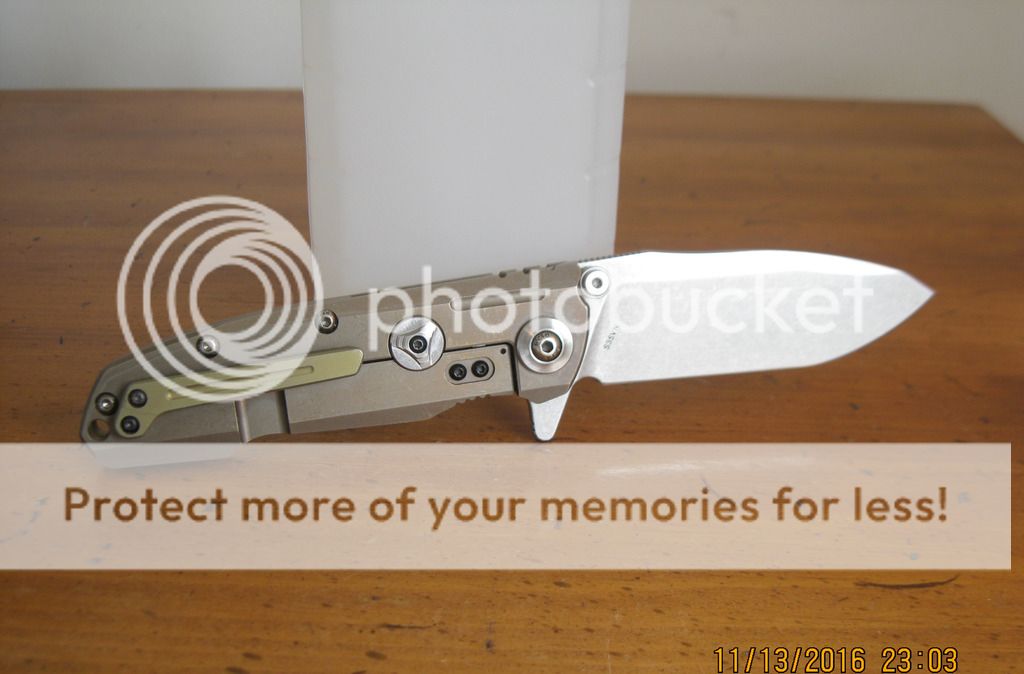 8) Reate District 9. S35VN. No box. Early lock up, no stick. No blade play in any direction. Razor sharp factory edge. Perfect centering. Has a tiny amount of pocket wear.