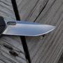 Paul Bos heat treated S30V steel. Contoured and machined G10 scales. Great flipping action. Has a touch of side to side play, but vertical lockup is solid. There is one place on the blade where it rubbed the liner at one point. I disassembled and cleaned it and it no longer rubs, but it is not centered. The primary grind on this knife was not even, and that shows in the secondary bevel which has been convexed to 15 DPS and is very sharp. Please see the pictures.