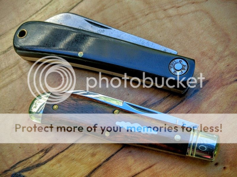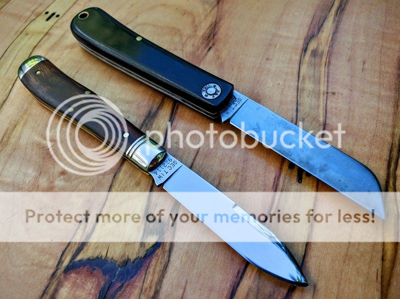GEC Farm & Field 47 in Black Micarta: $55 Nice pinch-able pull, carried and sharpened. Some patina on blade, carried and sharpened, hardly used. Blade is super sharp and centered, spring flush open/closed. The 92 in the pictures is gone.