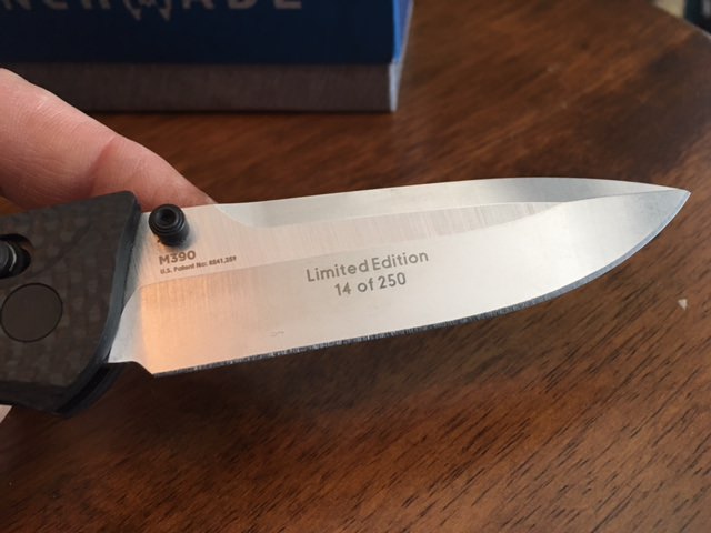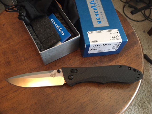 1) 730-1501 - A dealer exclusive Ares model with carbon fiber scales, M390 blade steel, and blue standoffs. Excellent condition. Carried once or twice, cut nothing with this blade. Original box and baggie included. $400
