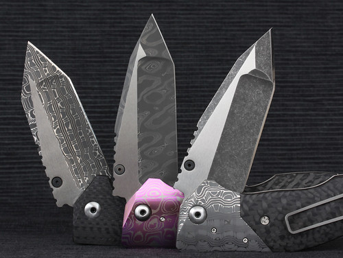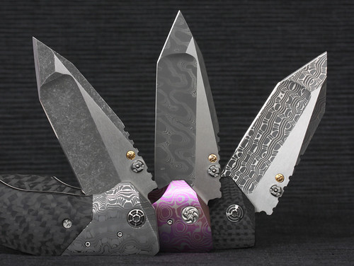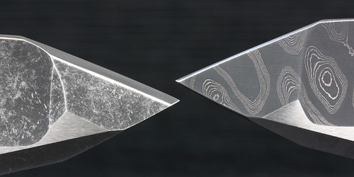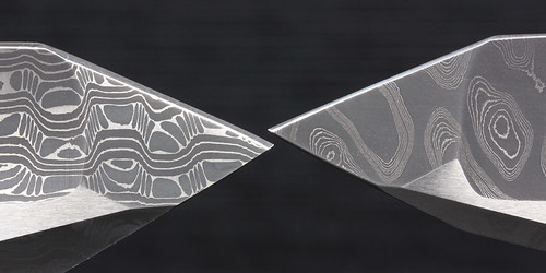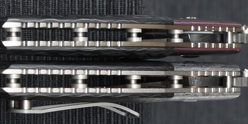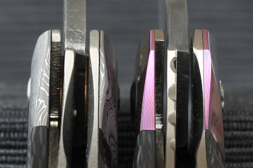 Chad Nichols' Raindrop Mokuti in purple & silver, Chad's blackout damascus, Black Site's broad-weave carbon fiber and Allen's supreme grinds... talk about having nailed it! Those were the materials, patterns and colors I had hoped for and received, but the excitement doesn't stop there! If you know Allen and his work, you'll know that he is always looking to challenge himself and to constantly "change things around". Some of these changes are aesthetic in nature, like the new look of the polished liners found on this Saboteur. Other changes are actual refinements accumulated from Allen's WIPs and constant innovations, like the subtle changes to the Saboteur's grind and edge (see comparison images below).