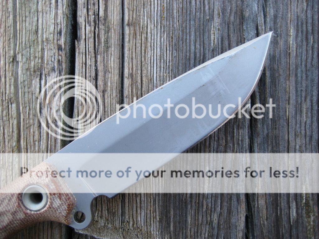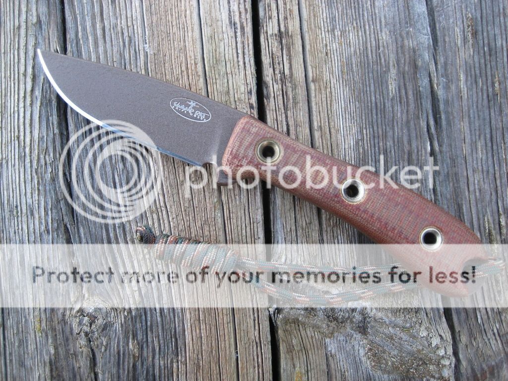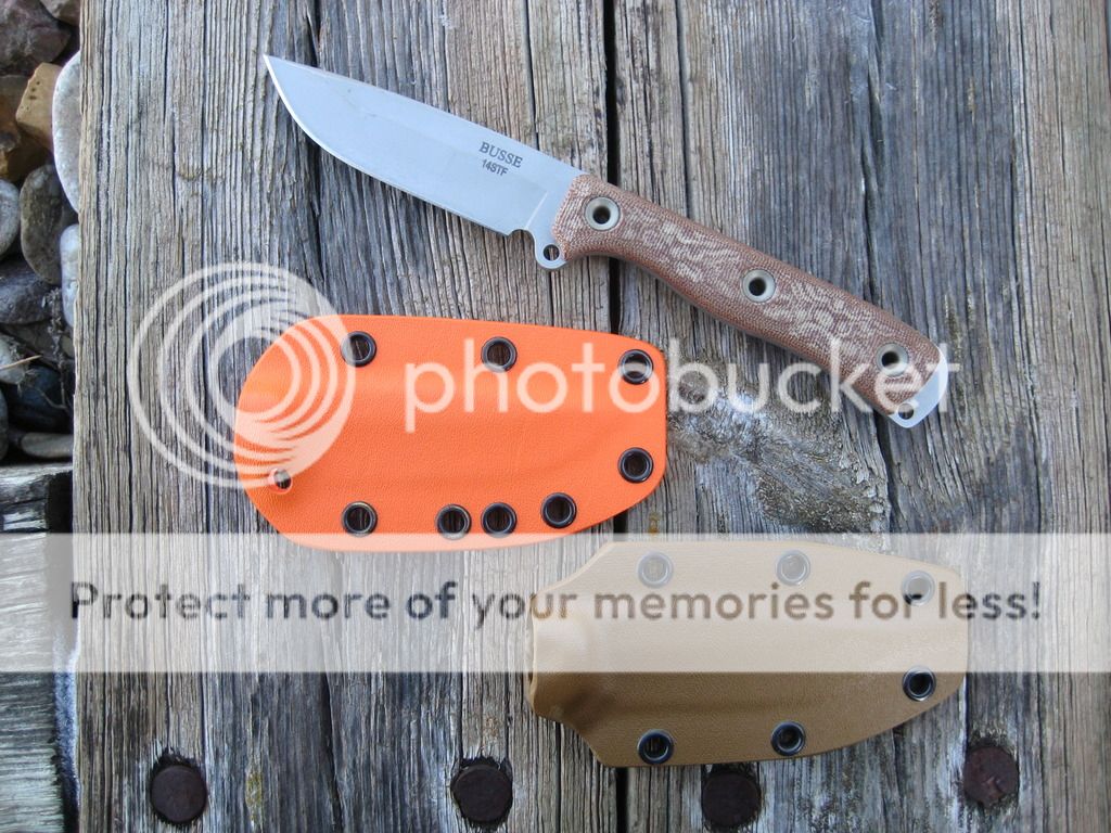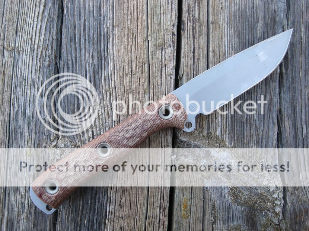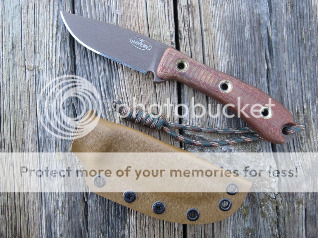 User Anniversary Mean Street Military Overrun (AMSMO) with Double Cut finish and tan canvas micarta handles. Comes with 2 kydex sheaths: one orange Buy Brown and one coyote brown. Price is $265. SOLD