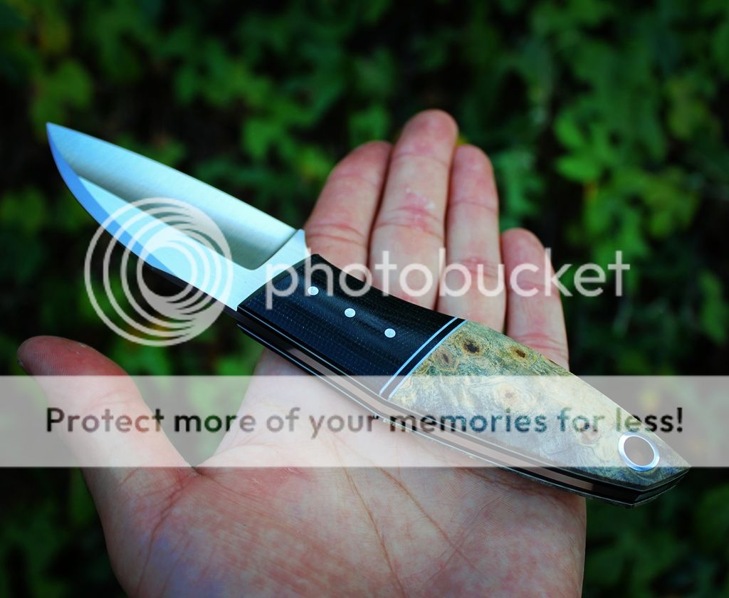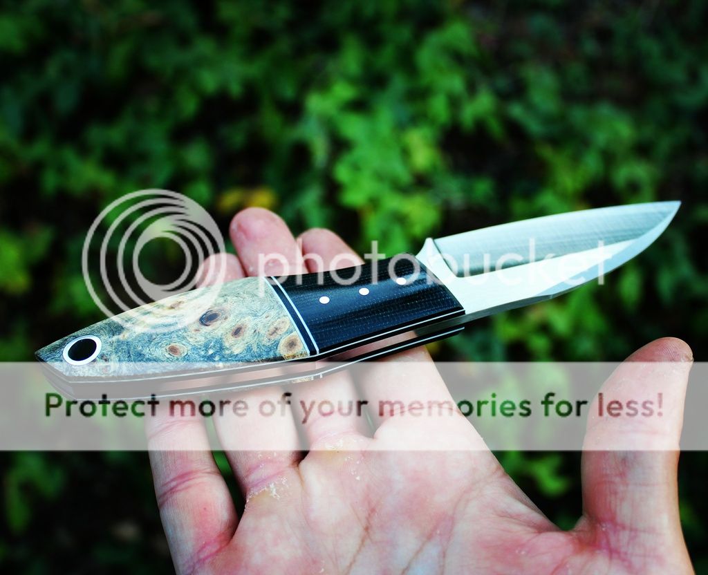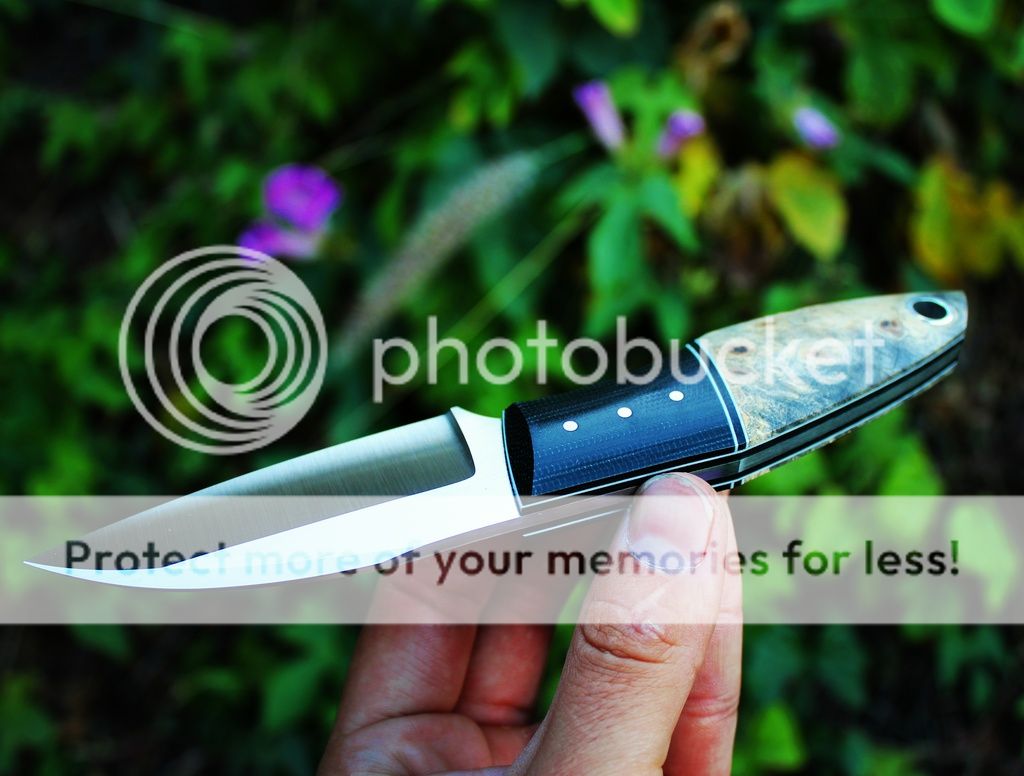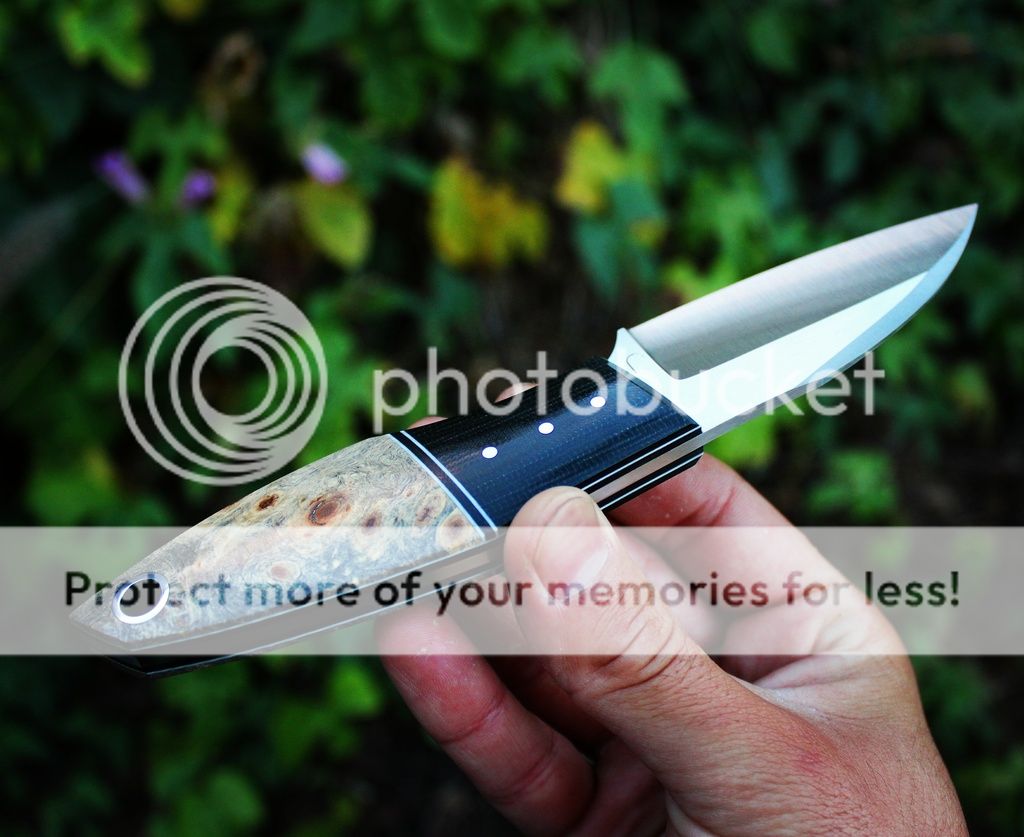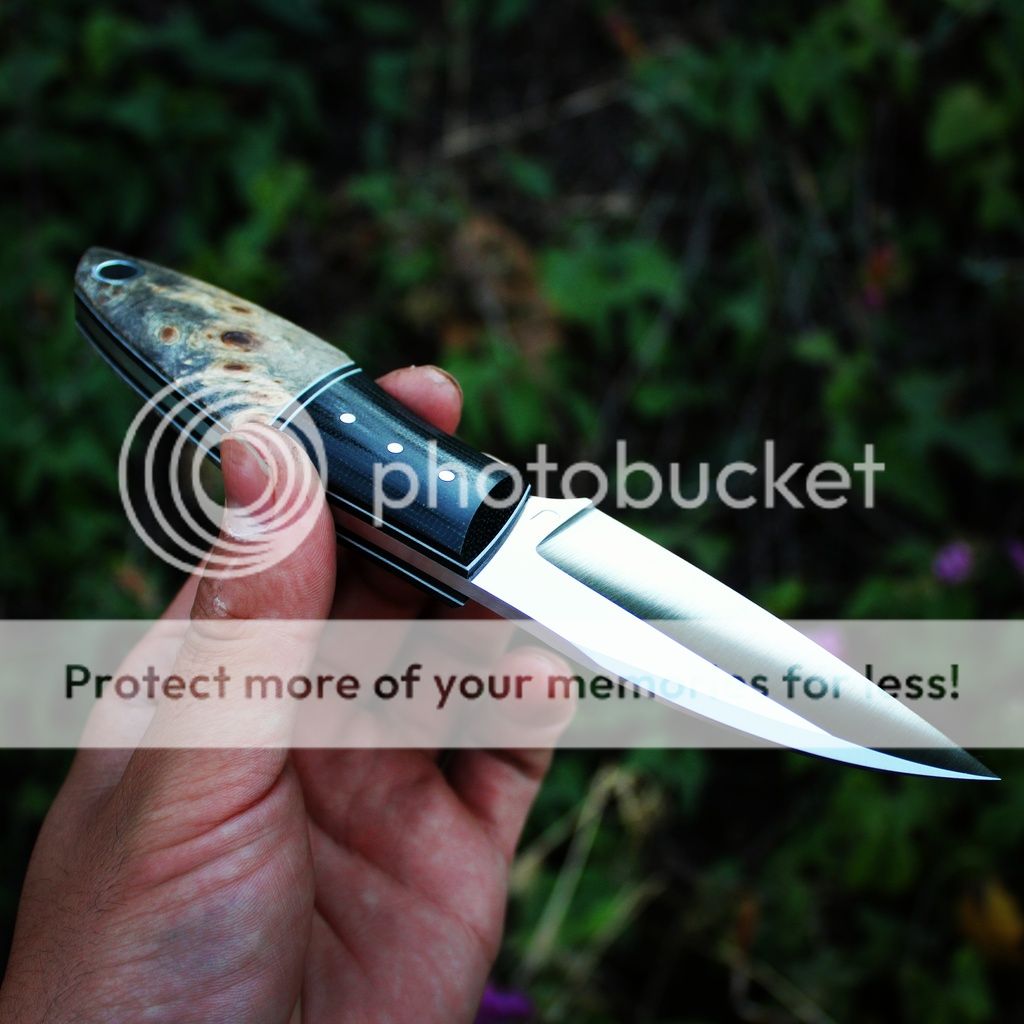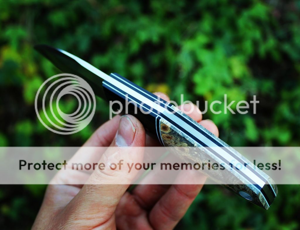 Scales are black micarta, white/black G10 and Micarta liners, stabilzed buckeye
