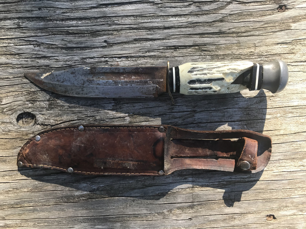 I got this off a friend. It was his brothers when they were young adults. It was in bad shape, a bit rusty and the guard was bent, and the handle washers were all askew. I disassembled it and cleaned it up good and got it in shape to serve another 60-70 years. I’m working on a new sheath (please excuse it as it’s not finished). I have the original but it’s not in the best condition.