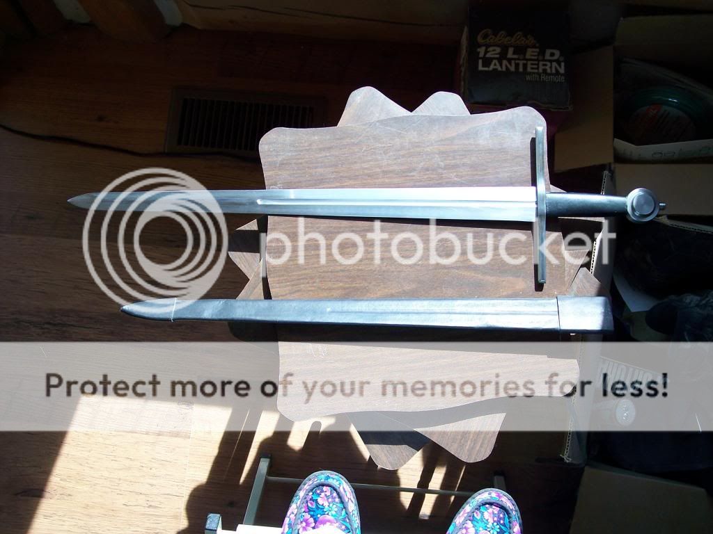 This is an Angus Trimm Short Sword, 23 inch blade, 29 inches overall. The sword is unused but has some marks from storage and some oxidation marks on the hilt and above the leather handle. Comes with leather scabbard. $395.00.