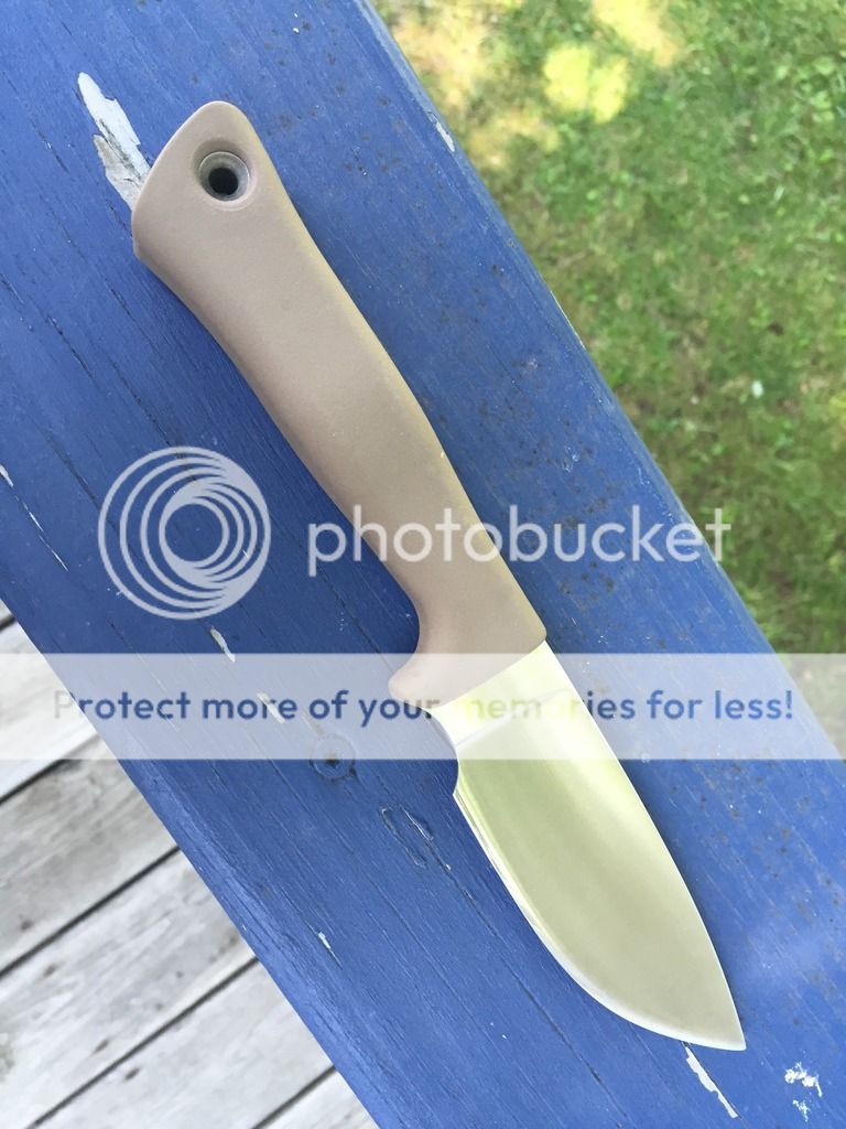 I modified it, adding a choil. There are two scratches by the plunge line as you can see in picture. There is also a little malformation on the res c handle as seen in the picture of the scratches by the plunge. Has been stropped and lightly used. There are no scratches other than the ones mentioned. Price includes paypal fees, regular priority shipping in the USA and an AZWELKE kydex taco in brown.