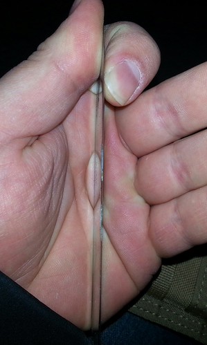 Edit:So when I got the mail today, I had a strange box to sign for.. And low and behold! A BRAND SPANKIN NEW BLACKBIRD! This one was fresh from the makers with its own cardboard sheath and another spec-ops sheath!! Thank you Ontario! This blade seems to be the same thickness, but it seems to be a thicker grind. As in the grind guy gave me some more steel on the edge