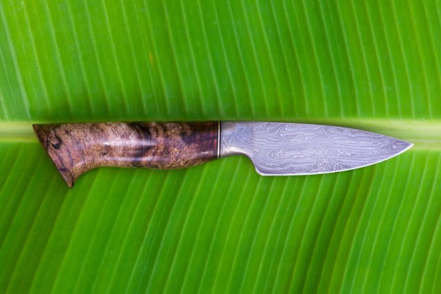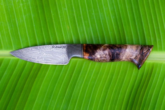 3.25" blade length, 15N-20/1080 damascus, spalted maple handle.