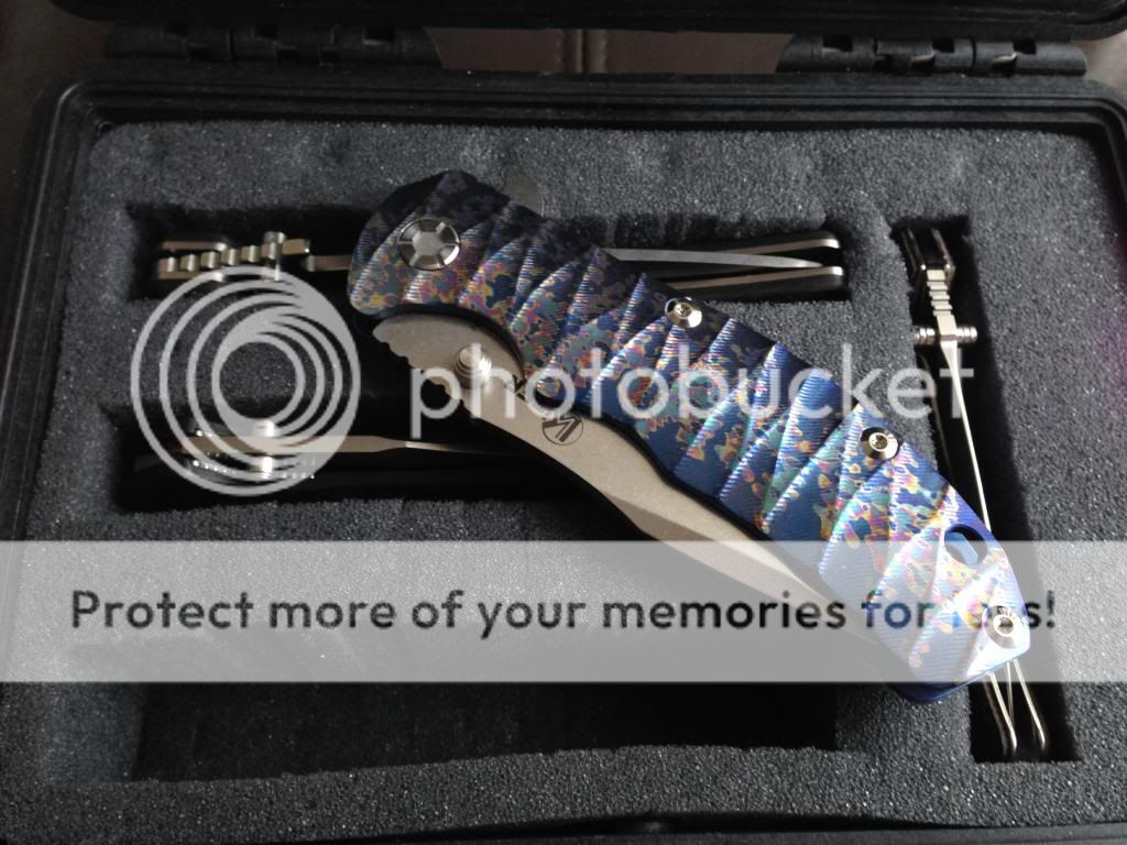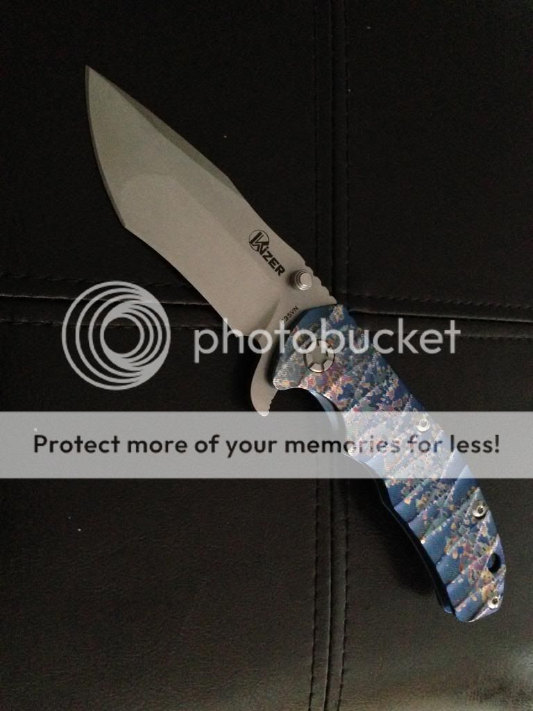 Went to see my local knife broker yesterday. He went to Blade and I figured I'd see how it went and what he brought back. Added a Diskin to my want list and he hooked me and my brother up with some Blade freebies. If you saw my other recent thread, you know I was on the fence about a ZT 0770CF. Took another look at it and still couldn't buy it. Got to looking through the cases and saw some Kizers he didn't have before. He has had a couple models in stock since they came out and they were all the original tip down only models. Well he bought a bunch at Blade and I absolutely fell in love with one. The Ki401T. Ti frame lock, crazy anodizing, flipper, and a recurve compound grind that tickled my sweet spot. And for roughly the same price as the 0770CF. I had to have it.