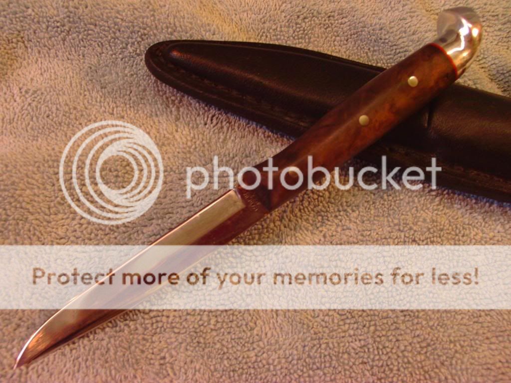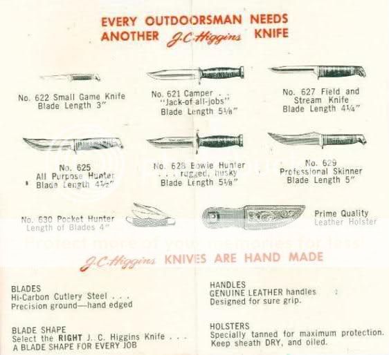 hello all! this is my first post as i am new to this forum, so be easy on me lol. i am a avid J.C.Higgins collector from their guns and knives to their camping and sporting goods. i recently got as a birthday gift a odd smaller than usual straight blade knife that has really nice walnut handles, and that leads me to my question. i know that the early Higgins knives we're made by Western and the later ones made by Schrade Walden. But to my knowledge they all had leather wrapped handles, with the early Western ones being split by the tang of the blade both top and bottom. this one is split like the old western style but with wood instead leather. any knowledge would be greatly appreciated!!
