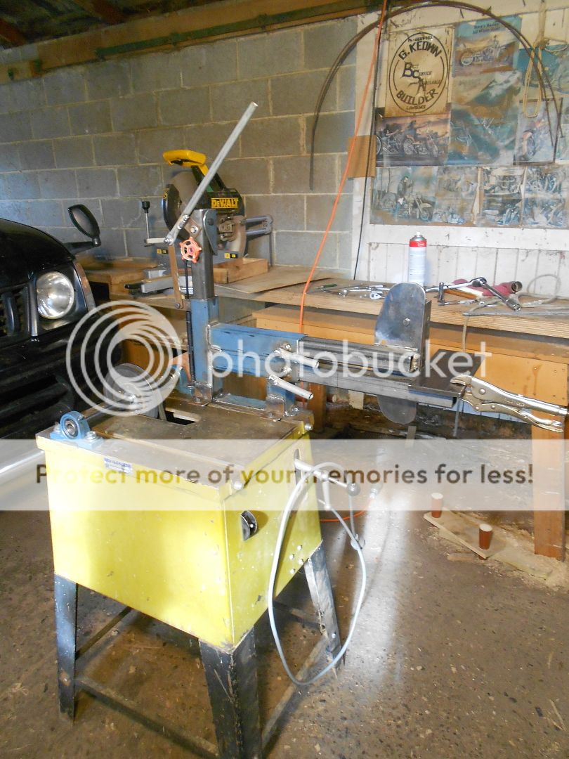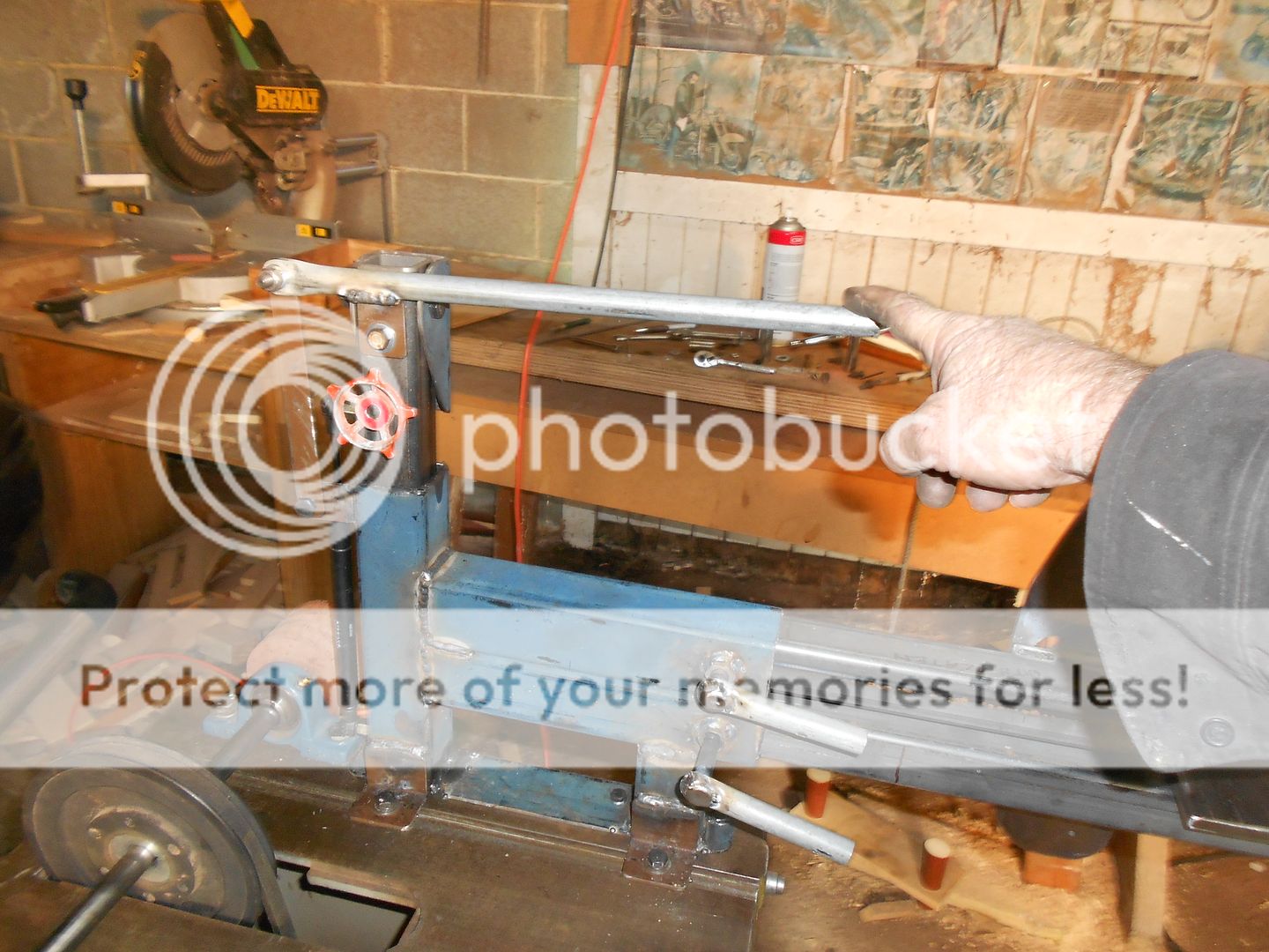 The handle of an old gate valve made for a good tracking adjuster wheel and a length of pipe flatened and welded to the bolt head will allow for tightening up on the two sliding tool heads.