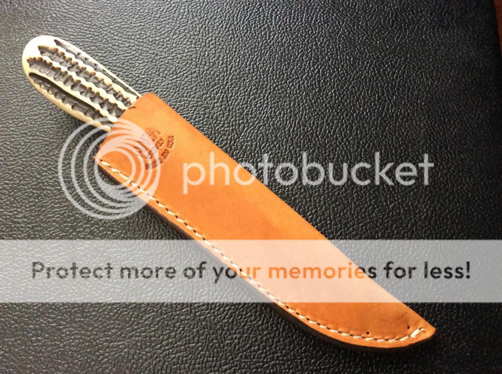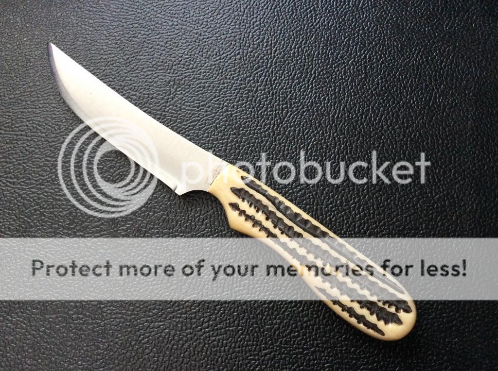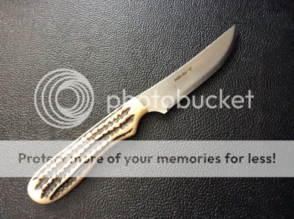 Anza upswept bird & trout. Mint, unused, uncarried. Handmade and ferociously sharp. Blade is carbon steel and very thin at .070". OAL is 8 7/8". Blade length is 4 1/2". Handles are jigged bone, very nicely done. Comes with a good quality sheath. Made in the USA.