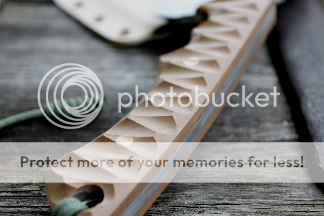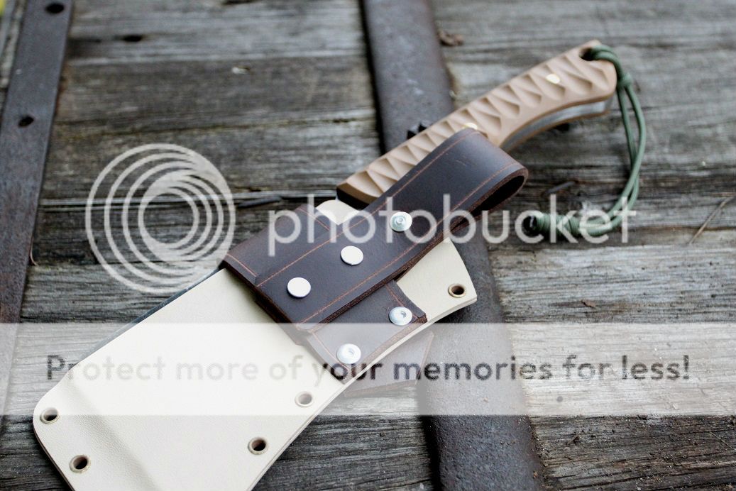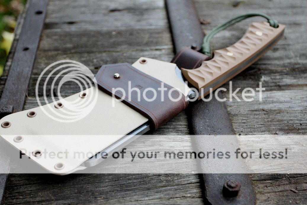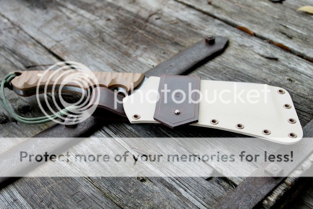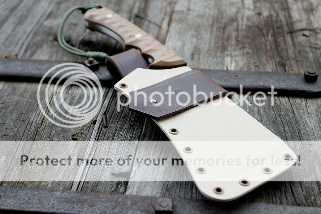 sheath is desert tan with aluminum and coyote brown hardware, finished off with some beautiful buffalo hide!