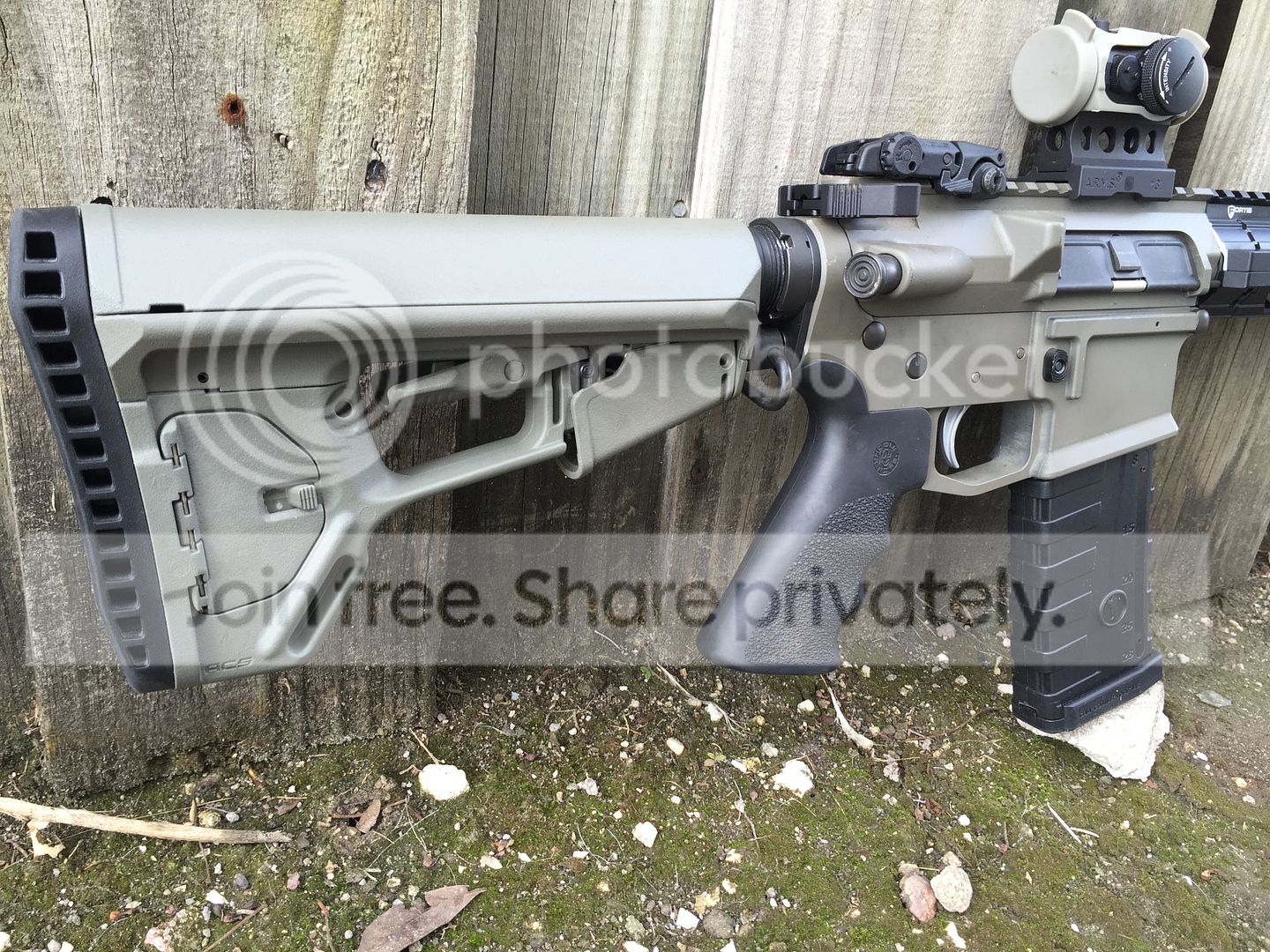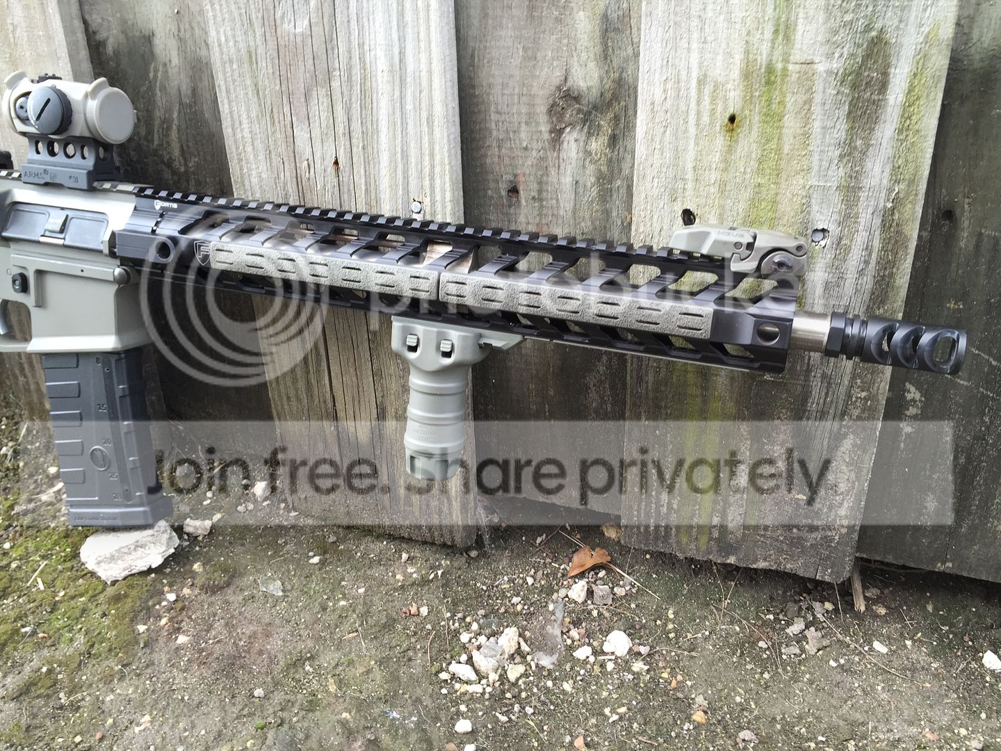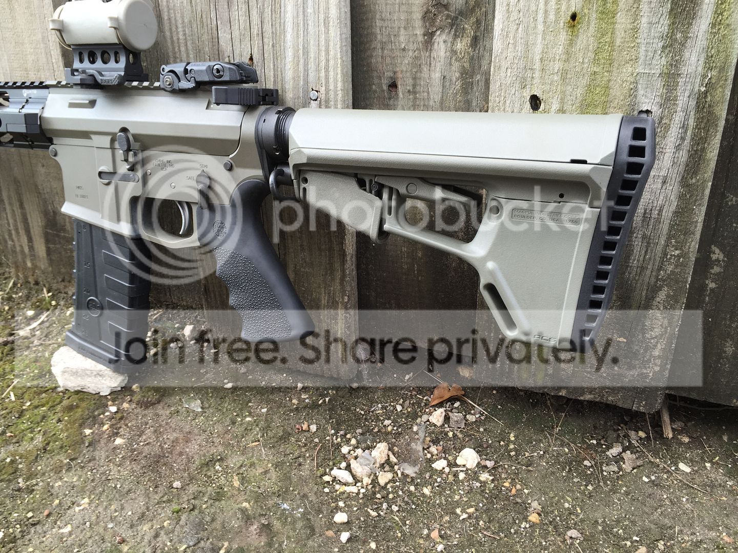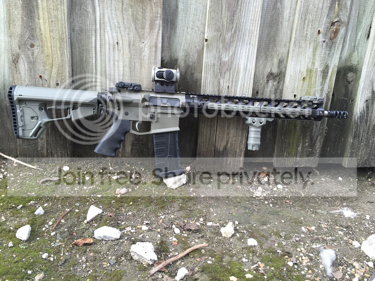 Aimpoint Micro H1 2 moa. With tango down foliage cover on a arms QD mount.