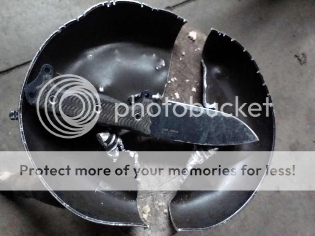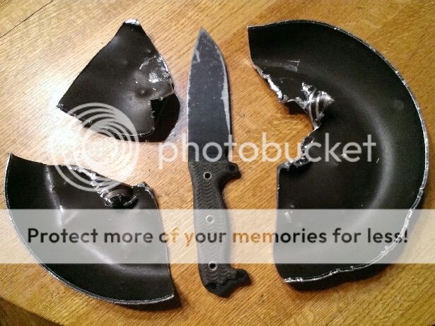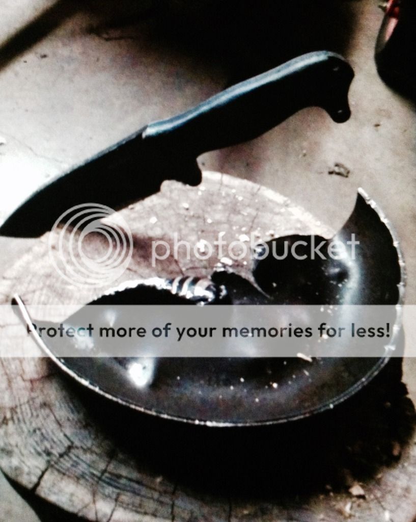 I will continue to post pics of ASH beatings and push the envelope further and further. At this point......after chopping close to a half a cord of firewood......shoveling out a new flower garden in rocky soil......chopping and stabbing sheet metal......hacking on a 1 inch cold rolled steel bar and now dissecting a frying pan......the only signs of wear is a slightly dull edge. No chips rolls or nicks.