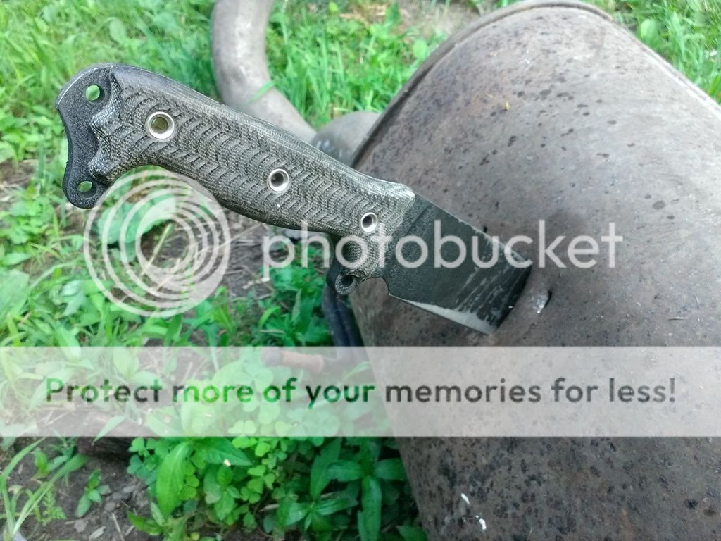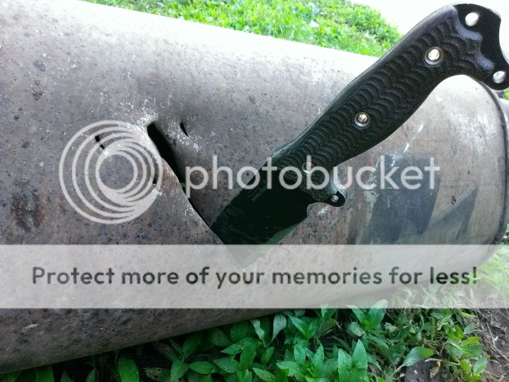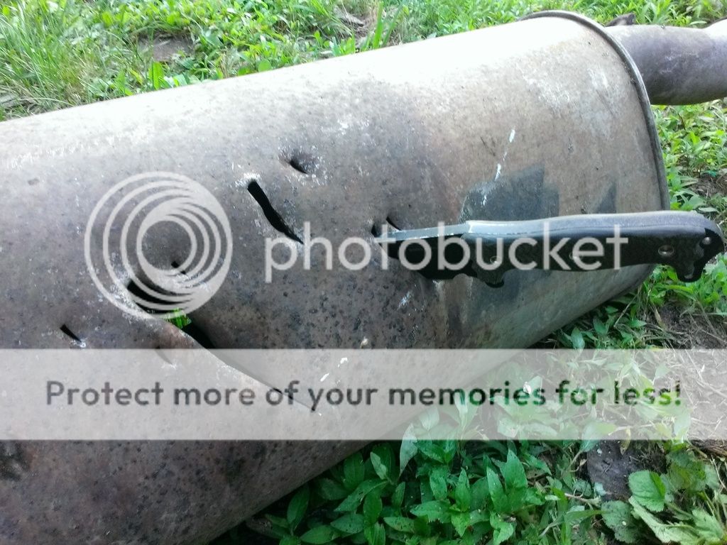I made a similar post in the Swamps forum with the Kill Devil. This is the other side of the same muffler. Considering how difficult it was for my devils spike to penetrate this.......I was blown away at how deep the ASH bites in a stab. I've been stabbing different mediums for the past month or so now and I am continually impressed of its stabbing power. This combined with a seemingly indestructible edge.....and we are looking at arguably the most awesome knife ever made.