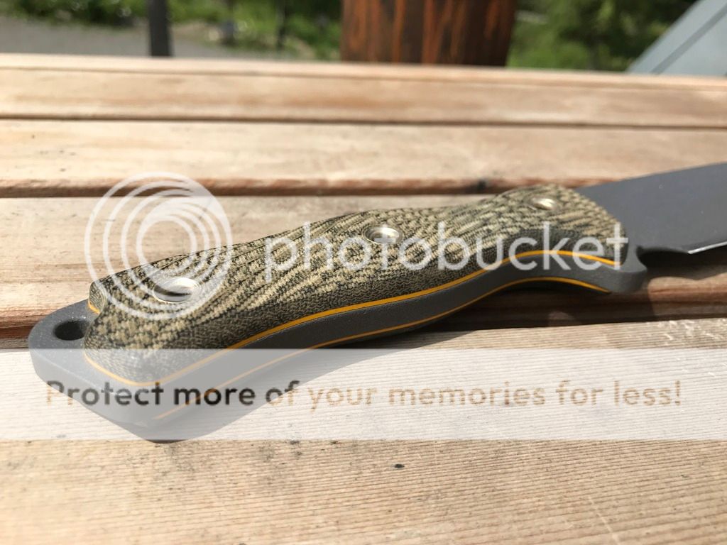 3. Custom Shop SwampRat Rodent 6, R6, SR101, With the Top Guard Removed and Drop Point work done by SwampRat. Black Micarta Handles with Yellow Liners and Tanker Gray Blade. Unused but Sharpened. Super sharp. $260 SOLD