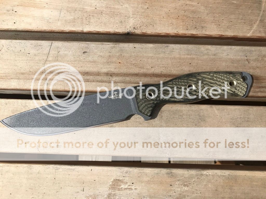 4. ASH2, INFI, Black Micarta Handles, Desert Sage Blade, Unused but the blade has been sharpened. Extremely sharp. Comes with a ambidextrous Skystorm Leather Sheath. $500