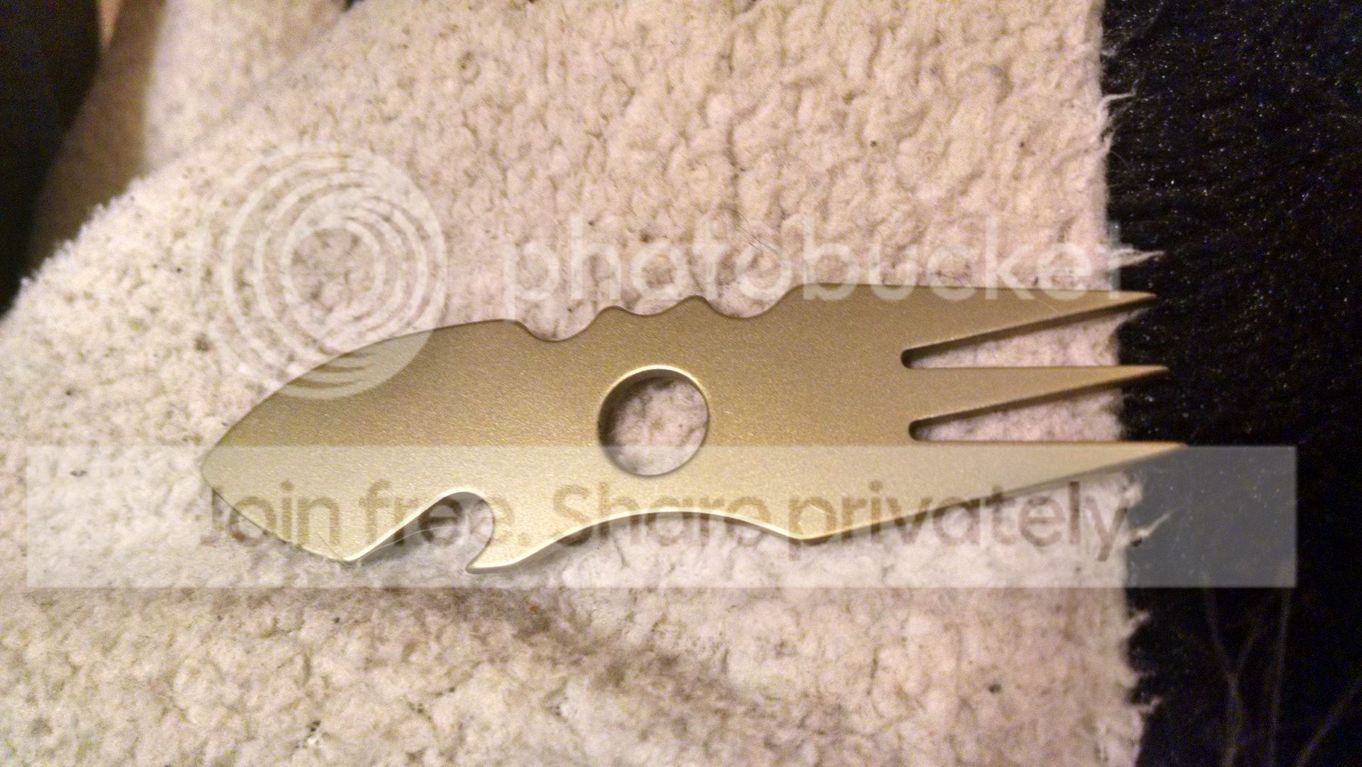 I took this in trade for an item a little while ago and it is time for it to go. The person I got it from was not definite of the material so I decided to give it a light gold ano to make sure it was Ti. They came in Ti or stainless that was also light weight. The first picture shows it with the original baggie and card, which are included, in bare Ti. The second two will show it with the ano. This was never used and the ano job is still fresh and intact.