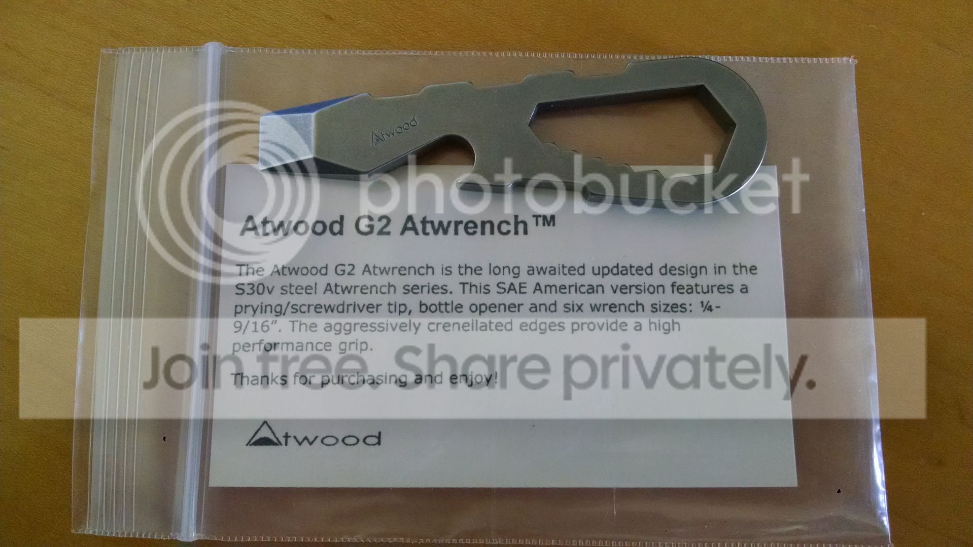 Atwood G2 SAE Atwrench. Carried for a year in my keychain but you'd never be able to tell. Never really used except on some bottles. S30v steel on this one - asking $75net shipped