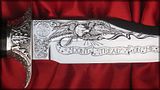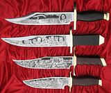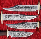 Aurum Etchings employed fine artists to do their work, Samuel Shortes was one of them and you can see the quality of some of his work below on the kitchen knives. Another famous artist employed by Aurum etchings was Ron Adair. Here below is an example of his work on the WW2 knife Schrade bowie, he also was commissioned to do work for the US mint.