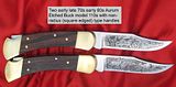 The famous model 110 previously had great success a utility/hunting knife but took the interest of collectors worldwide when many of these began to appear on the market Etched by Aurum Etchings back in the late 70s early 80s and continued through the 80s until 1991 when Samuel Shortes set up Buck knives own etching facility for them. It is difficult to estimate the enormous impact on interest from collectors that resulted from Aurum Etchings decorating the model 110 and many other knives from Buck through the eighties. There is currently still a cult like following among collectors for the humble buck model 110 due largely to the success Aurum Etchings had in introducing this knife in different highly decorative forms. One only needs to do a quick search on eBay to see masses of variations of this simple 110 model to appreciate the enormous collector interest that that was stimulated from those earlier years when a few highly decorative variations were first introduced into the market by Aurum Etchings. I presume that it is in part for that reason that Buck collectors will often pay a very high premium for an early 80s model 110 etched by Aurum Etchings.