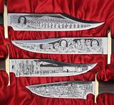 Later to follow was the famous Republic set aas seen here below. Introduced in 1976 it followed along the same lines as the Smith & Wesson collector series with the highest level of detail in the etch, The series of 4 knives the most famous of which was the Alamo were among the most highly detailed and intricately engraved (i.e. etched) knives ever produced.